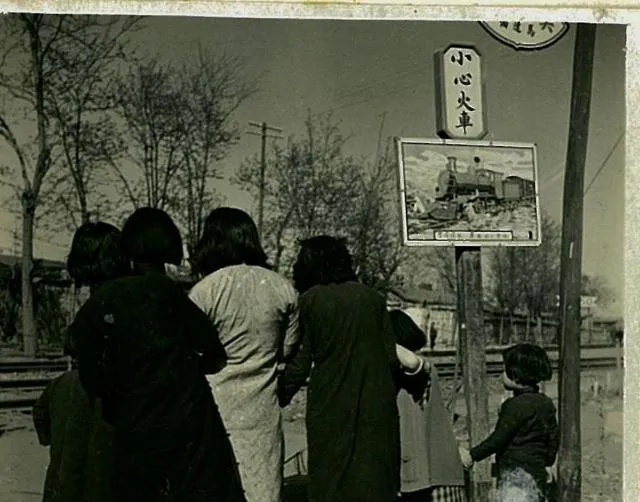 女人、孩子站在标示牌下,衣服宽大的旧长衫,站牌写着“小心火车”,老北京的城市边界感,就是靠铁轨和站台定住的,过了六点,马路都是冷的。