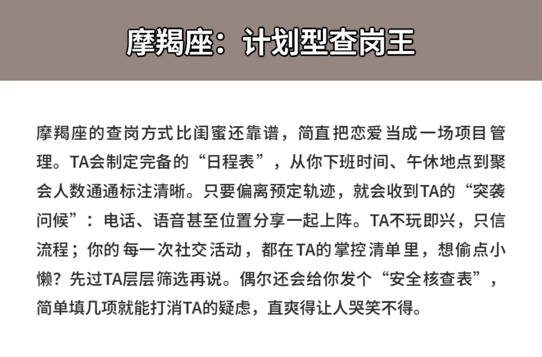 都说恋爱让人变傻,可有些人越恋越精明,分分钟切换成现场版侦探,拿着手机就开始“现场勘察”。TA随时给你演一部“监控大片”:翻翻聊天记录,戳戳朋友圈,连微信状态都要反复核对,生怕漏掉任何蛛丝马迹。有时候一条未读消息都能让TA紧张半天,午后茶会、下班小聚、深夜暗号……统统难逃TA的火眼金睛。今天咱就来扒一扒,恋爱里天生侦探头脑的三个星座,看谁最会查岗,连犯懒的机会都不给!