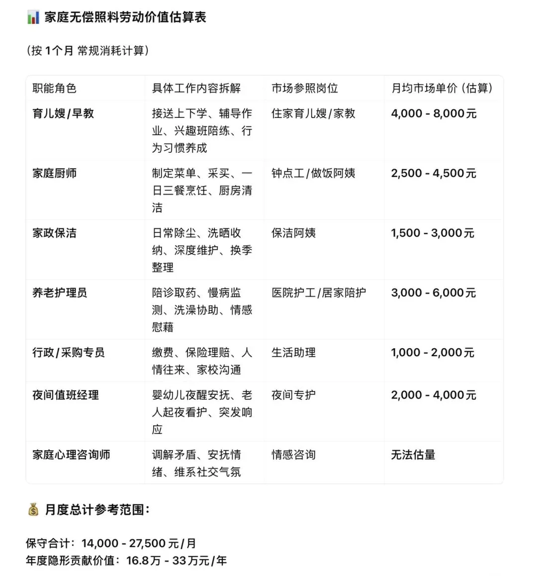 我制作了一张《家庭无偿照料劳动价值估算表》,按一线城市中等服务水平,将一位承担主要照料责任的女性日常隐形付出折算成市场价。