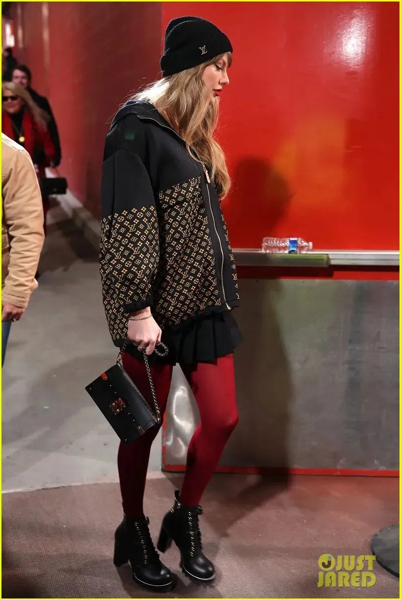 当时堪萨斯城酋长队对阵布法罗比尔队,霉霉穿了一身黑色套装外套和毛线帽,上面是巨大的LV Logo。