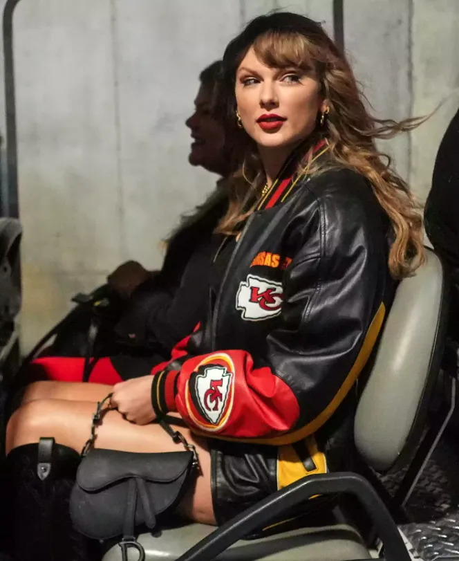 2024年11月酋长队对阵海盗队的比赛上,霉霉的一身辣妹风造型基本上总结了她的新风格:Christian Louboutin长靴 + Dior迷你包 + 超短裤 + 皮夹克。