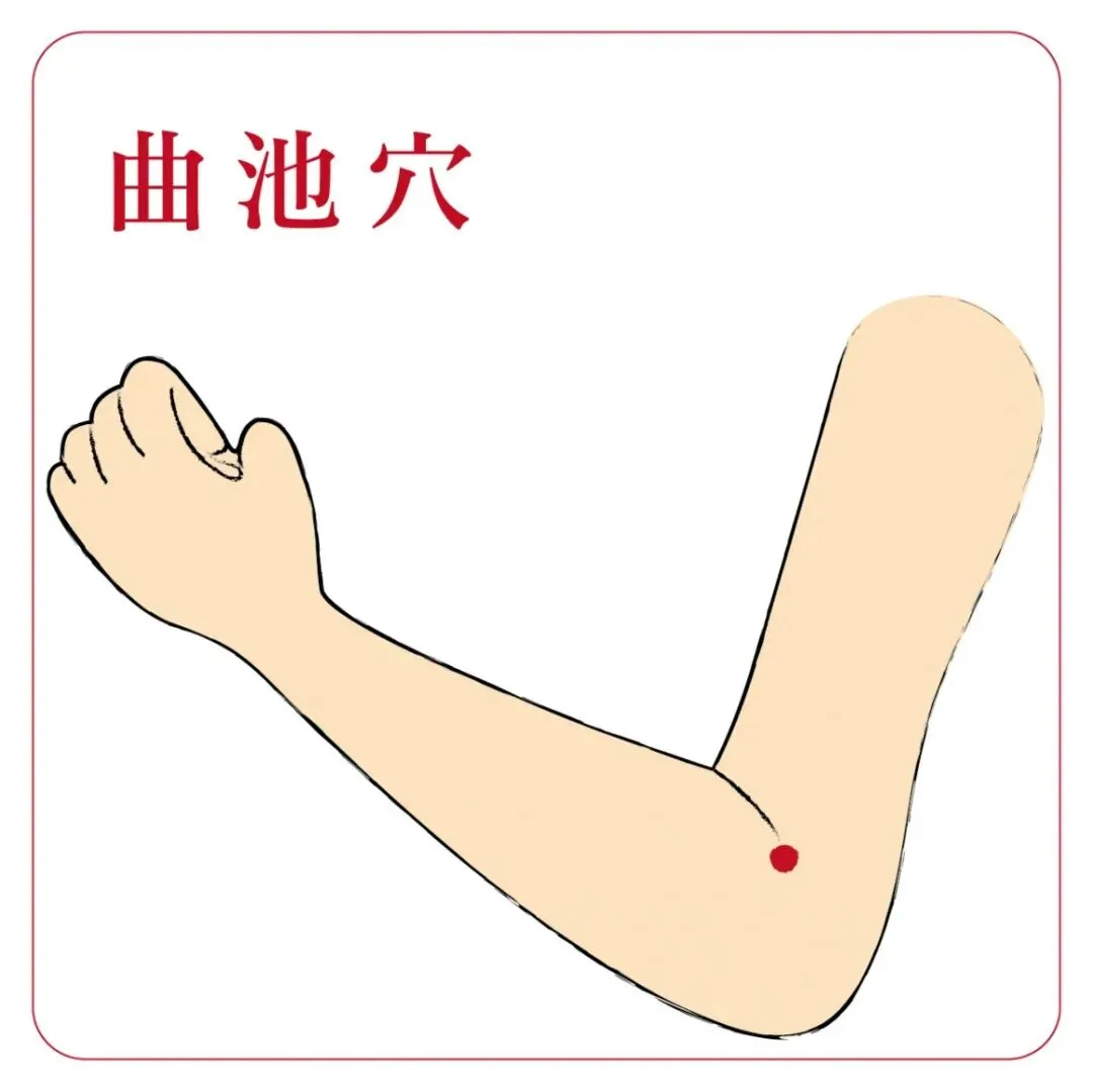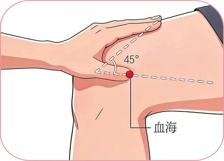 曲池穴在手肘横纹外侧尽头。血海穴在大腿内侧,膝盖骨往上大概三横指宽的位置。每个按三到五分钟,按到有点酸胀就行。曲池管祛风,血海管养血,两个一起按能缓解不少。