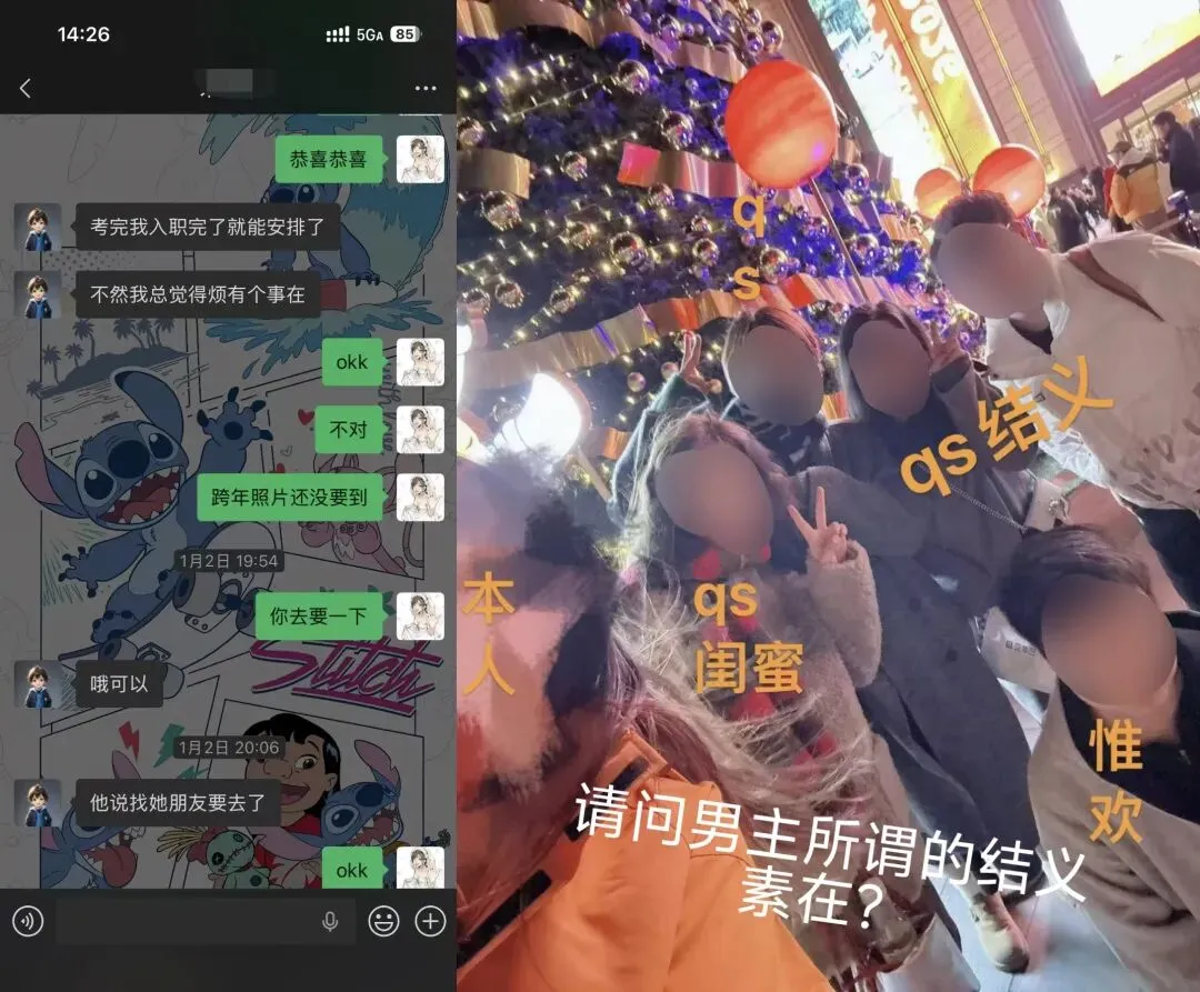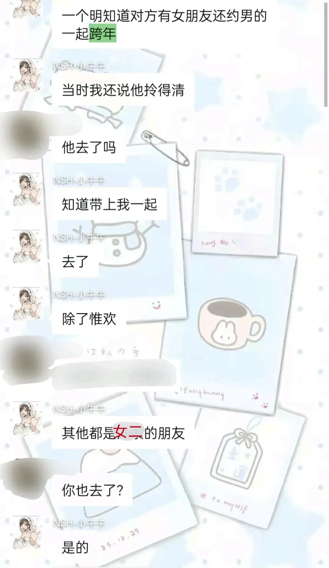 跨年夜出现了第一个矛盾点:男主和女二已经相约跨年奔现(女二知情女主和男主为情侣关系)后,男主才想起女主的存在,在问了一嘴要不要带女主,得到女二同意后男主才告知了女主。