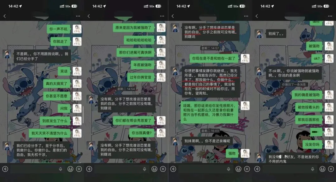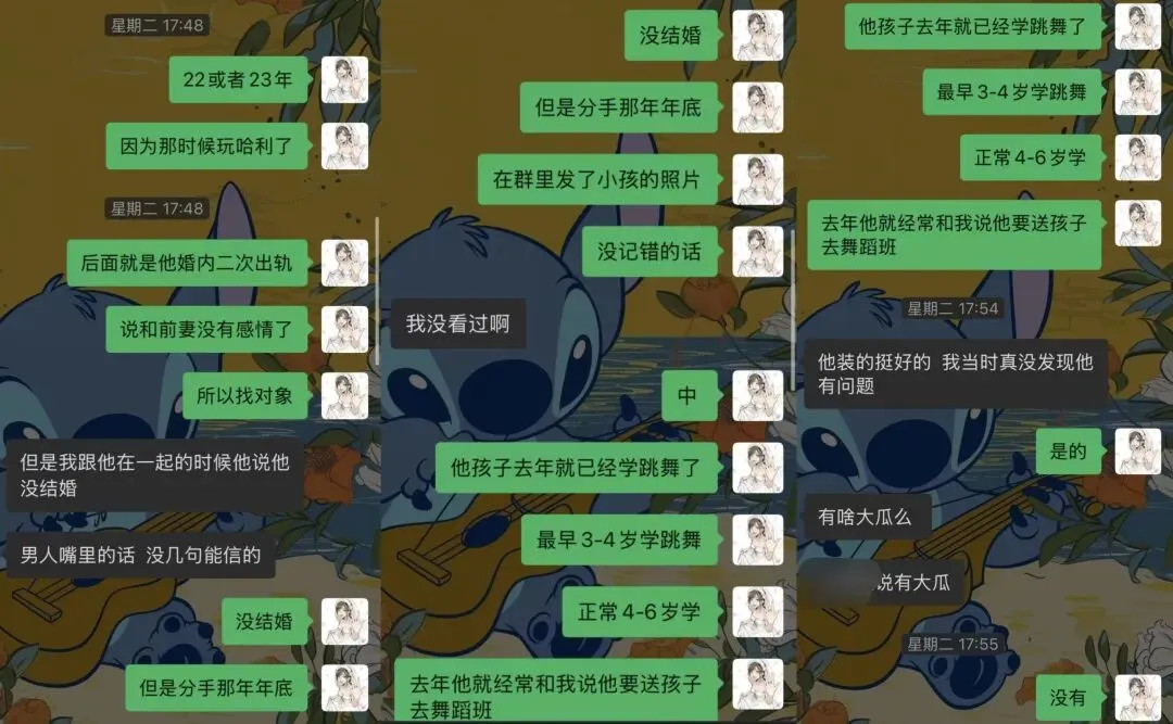 二月二十六苦主还和男主崩溃诉苦自己被客户骚扰,和男主说了以后,男主无动于衷,一句话都没有表示,只敷衍了一句在加练,此时间段男主已经在冷暴力女主了。在男主前任之后,男主在未离婚的前提下还谈过一个逆水寒情缘,感情出轨惯犯。