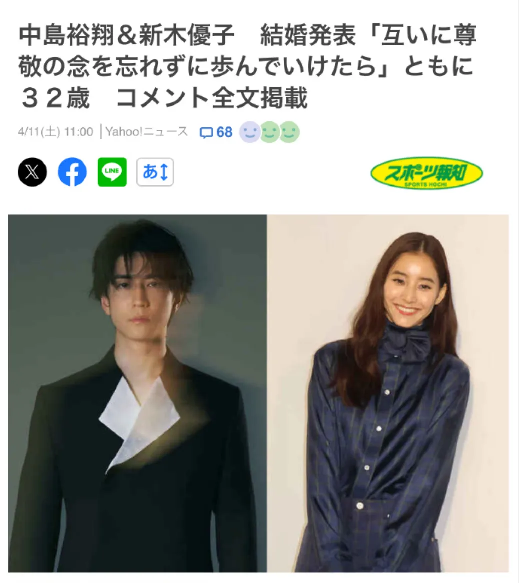 今天,中岛裕翔(32)发布公告,宣布了与女演员新木优子(32岁)结婚。