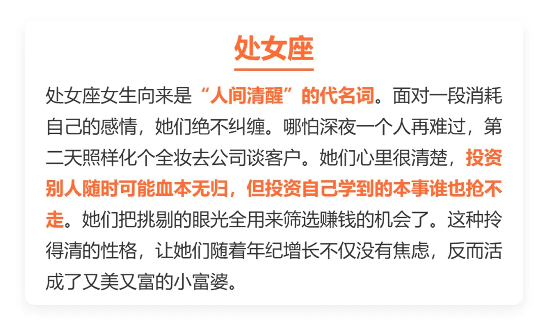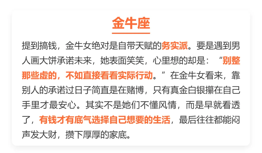 说到.底,搞钱.不是.俗气,而是.女孩们.在为.自己.的人生.兜底。愿咱们.都能像这.几个星.座一.样保持清.醒,兜里.有钱,眼里有光,活出最.飒爽.的模样。