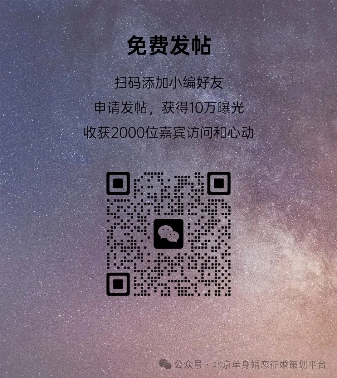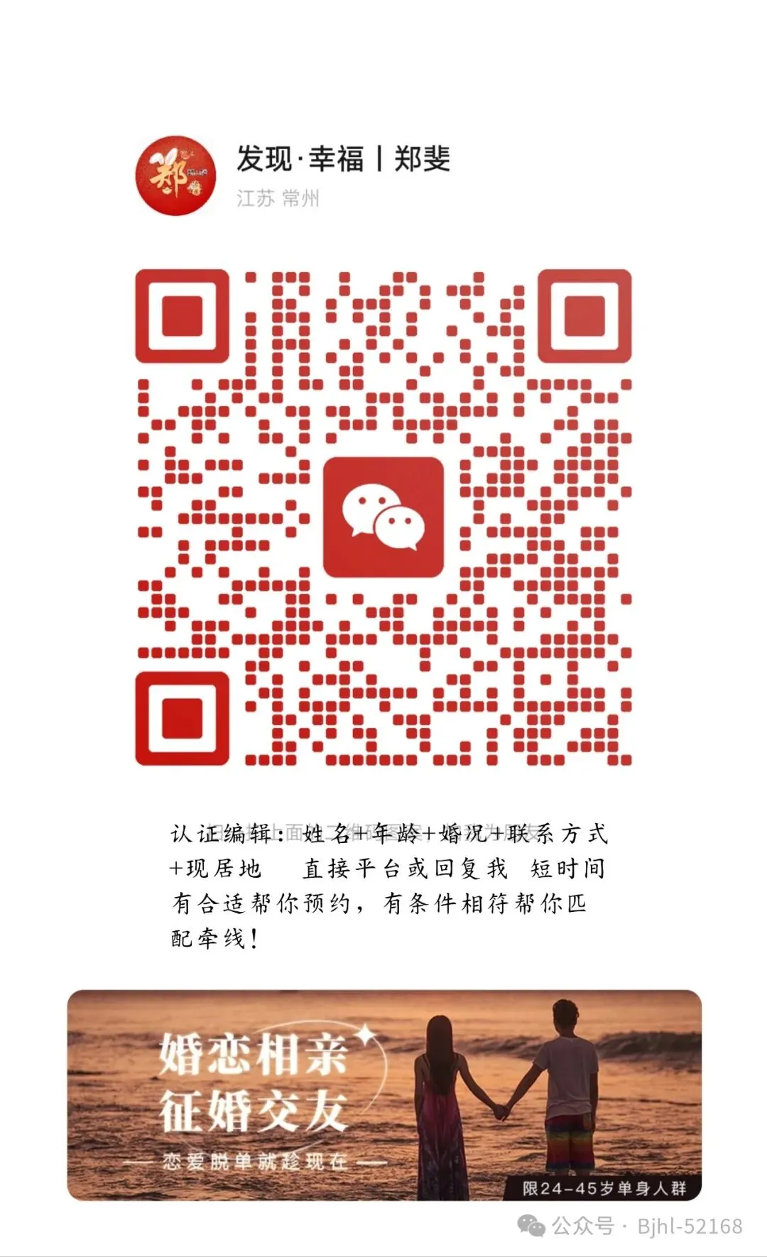 北京单身狗🐶交友签到贴💕许愿墙🌹发布征婚的注意事项!请写下评论↹写下你的个人情况(年龄、职业、兴趣爱好等),再许愿吧,让月老帮你实现☞别害羞,看上谁了就私信吧…咱们的微信群是公益群【邀请审核微信:ZF12315886】,可以免费加入,分成小龄群和大龄群,又分成免验证群和必须验证群(例如北京土著群必须验证)另外,本月老可以帮你发布征婚信息,帮你宣传,每个月老宣传的途径不一样的,欢迎来稿!温馨提醒女生,杀猪盘越来越多,请小心!