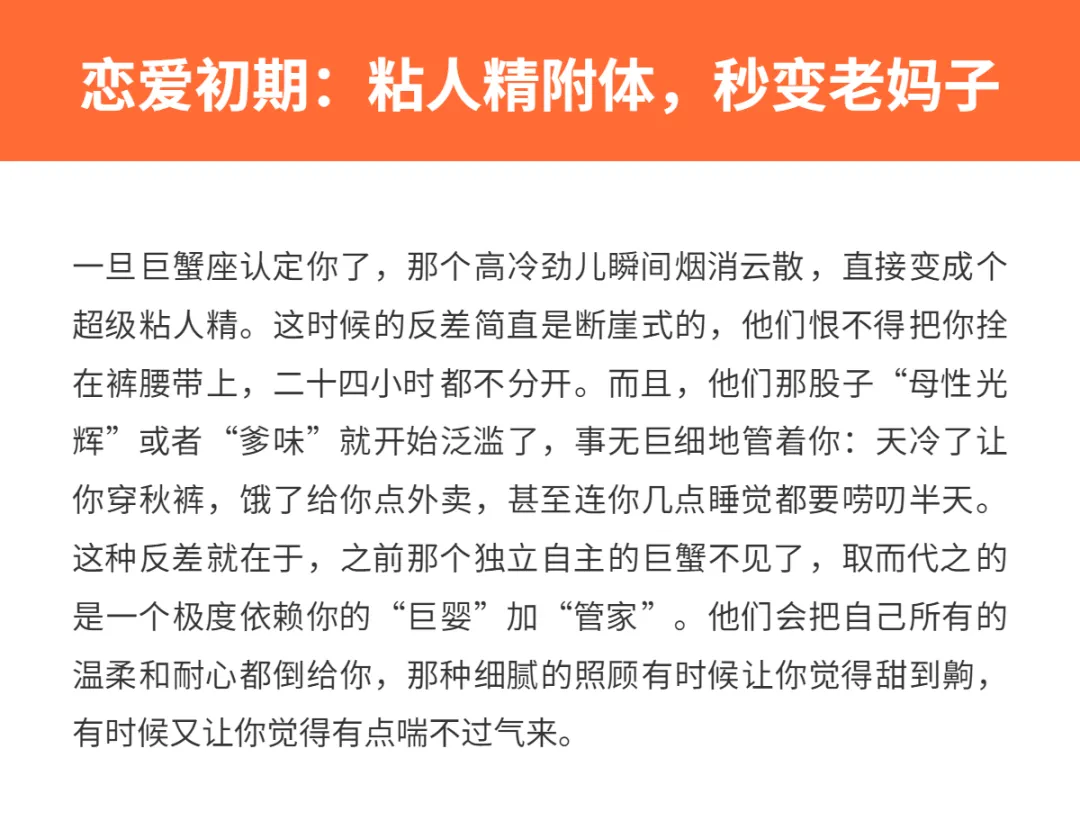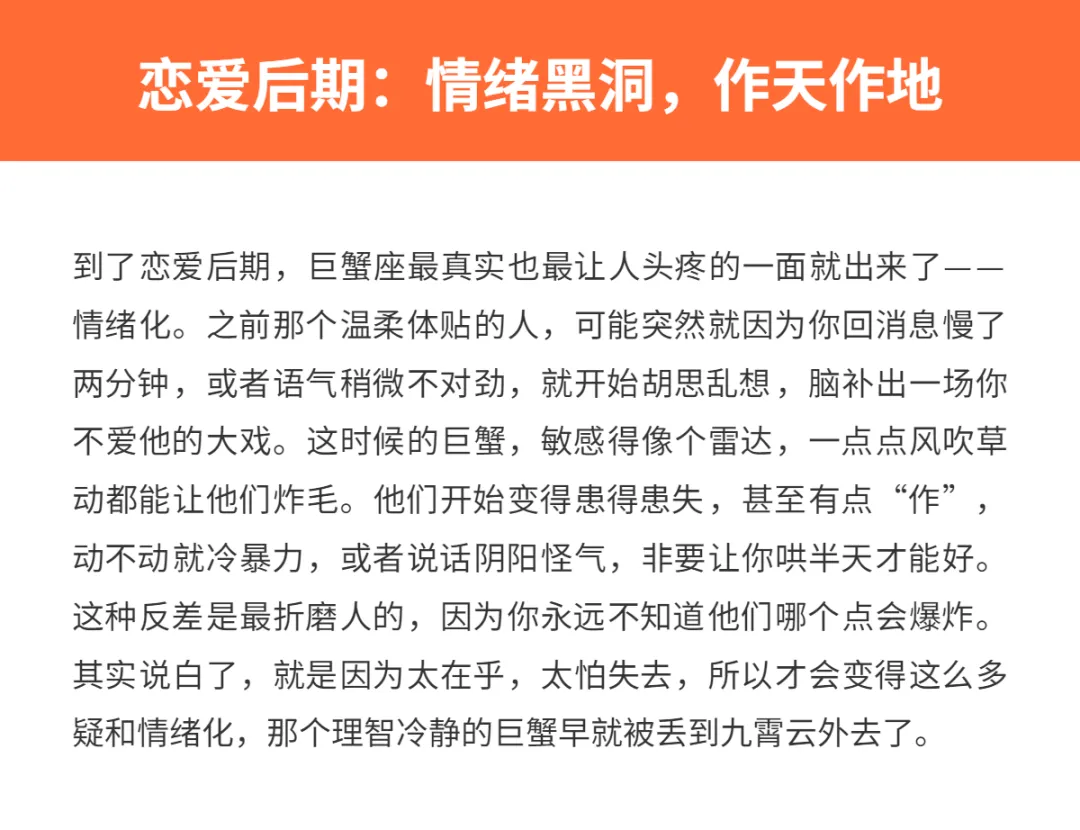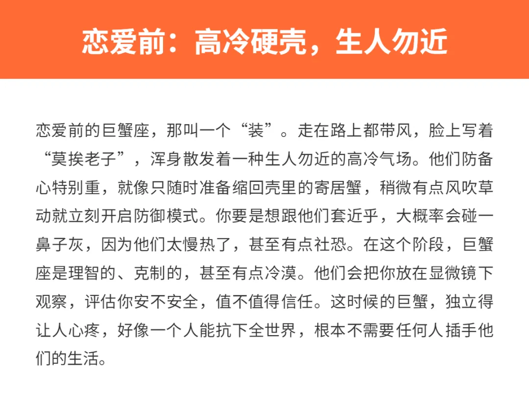 大家都说巨蟹座温柔顾家,是个标准的“老好人”,平时看着温吞吞的,好像没什么脾气。但你要是真跟巨蟹谈过恋爱,绝对会怀疑自己当初是不是瞎了眼——这哪是温柔小白兔啊,简直就是个情绪过山车!生活里那种“生人勿近”的高冷壳子,一谈恋爱全碎了。很多人都被巨蟹那层硬壳给骗了,以为他们多难搞,其实一旦动了心,那个反差大得吓人。今天咱们就来扒一扒,巨蟹座恋爱前后的那几副面孔,看看是不是把你家那位给说中了。