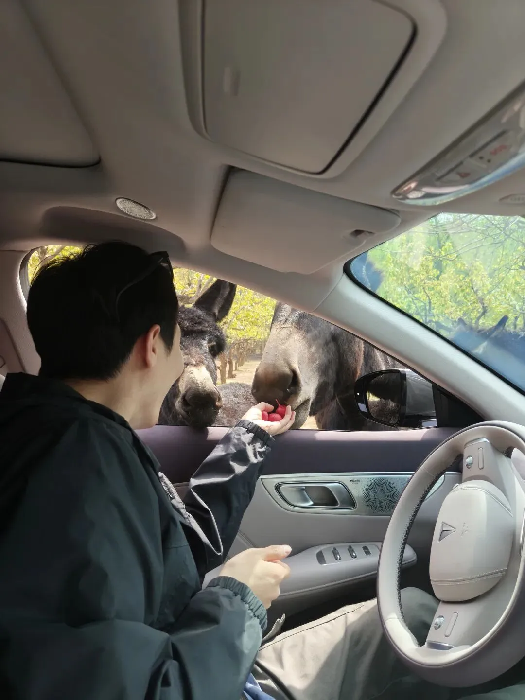 进了自驾区,车窗摇下来,风裹着柳絮和动物的气味一起灌进来。能喂的动物不多,主要是马、鹿这些脾气温和的大家伙。可以把大脑袋探进车窗,整齐的大牙凑过来叼走你手里的胡萝卜白菜,然后留下一身黏糊糊的口水。尘总被一头马攻击了半天,嚼碎的苹果和苹果渣弄的车里到处都是hhh真的很好笑。我却觉得那种温热、笨拙的触感,有一种说不出的亲近。动物不会伪装,喜欢你就要吃的,吃饱了就转身走开,干脆得像……嗯。