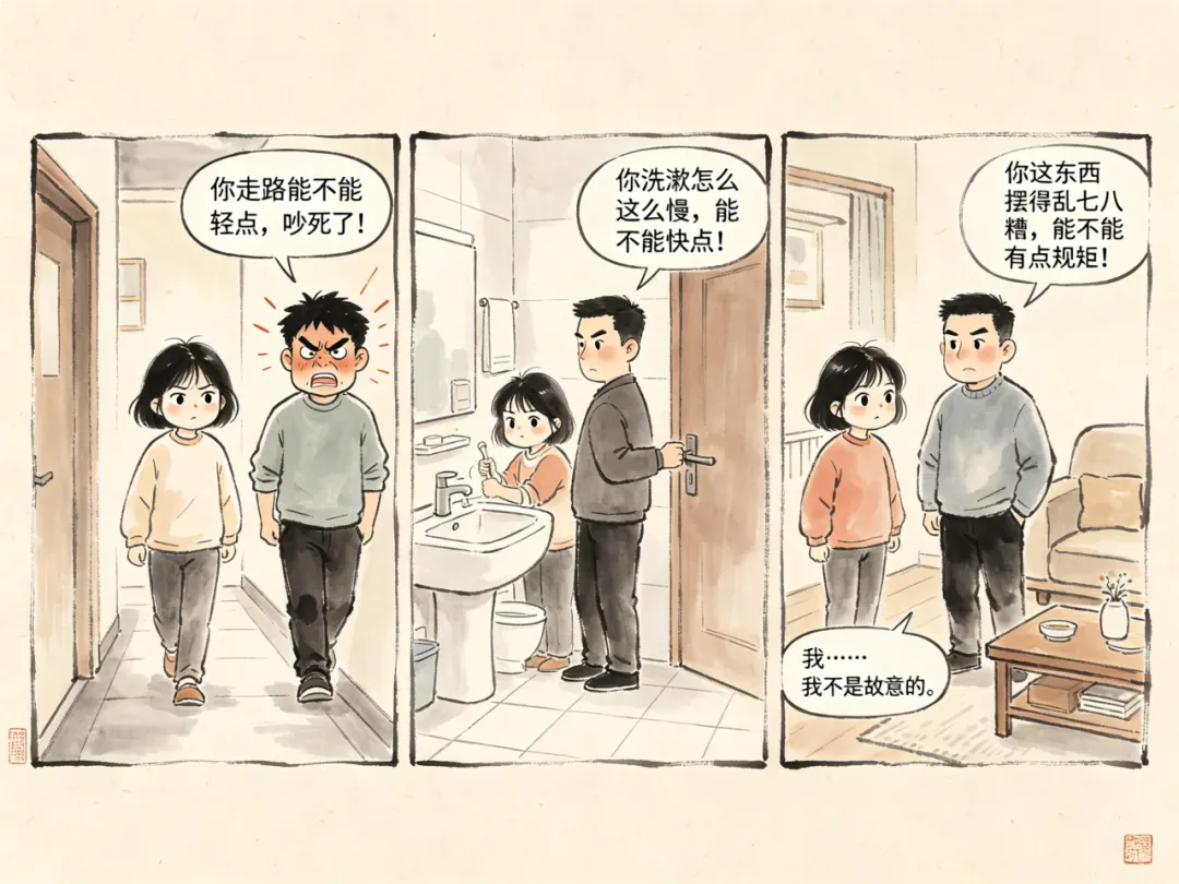 更让小夏憋屈的是,主动关心男友的工作,被暗指瞧不起他没本事;默默退出给他冷静空间,又被指责毫不在意。就连走路的声响、洗漱的时间、摆放东西的习惯,这些从前无关紧要的芝麻事,全都成了他发泄情绪的借口。