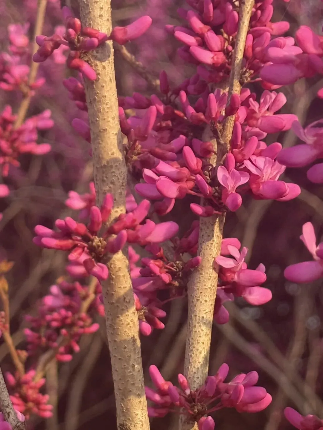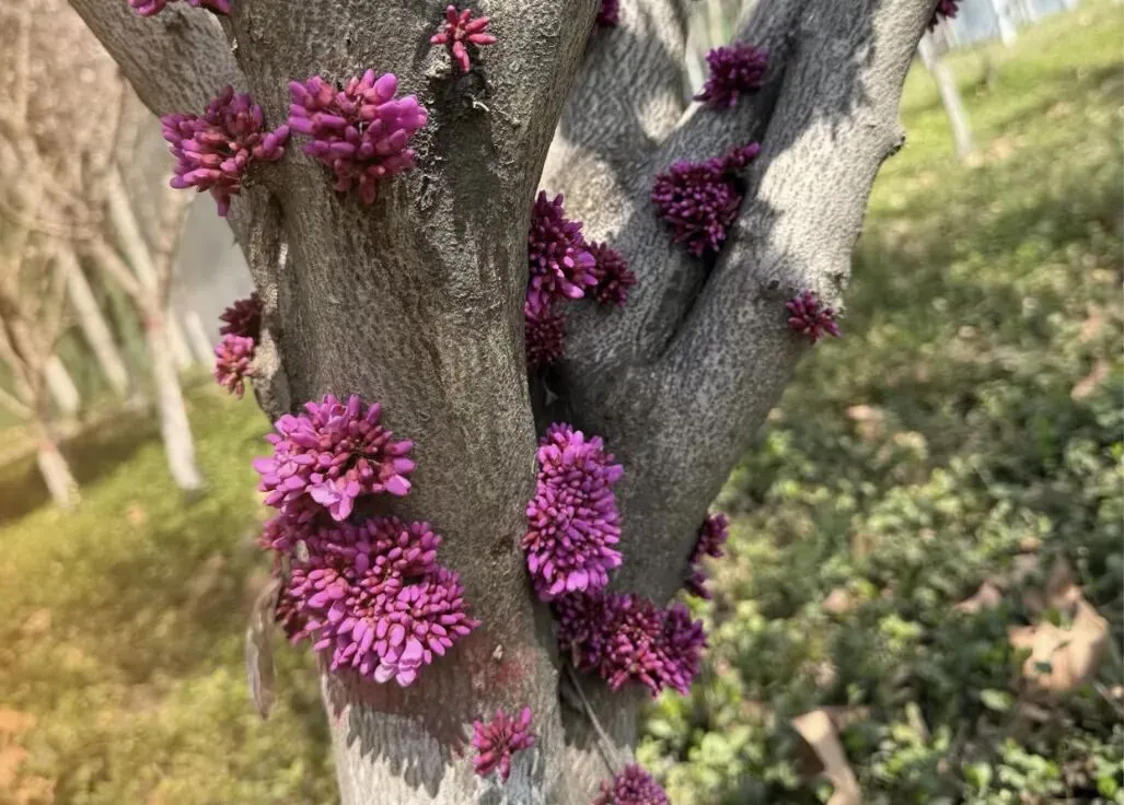 春分之后,紫荆毫不低调的就从光秃秃的枝干上一夜之间冒出一疙瘩一疙瘩密密麻麻的玫红色的花簇,它等不及了叶子,抢着就先开出了花。