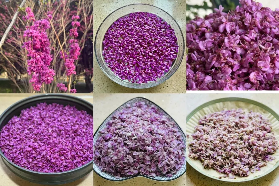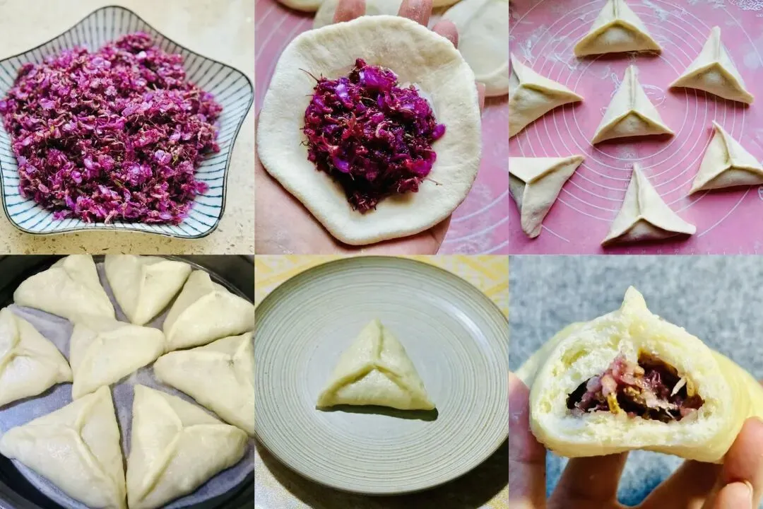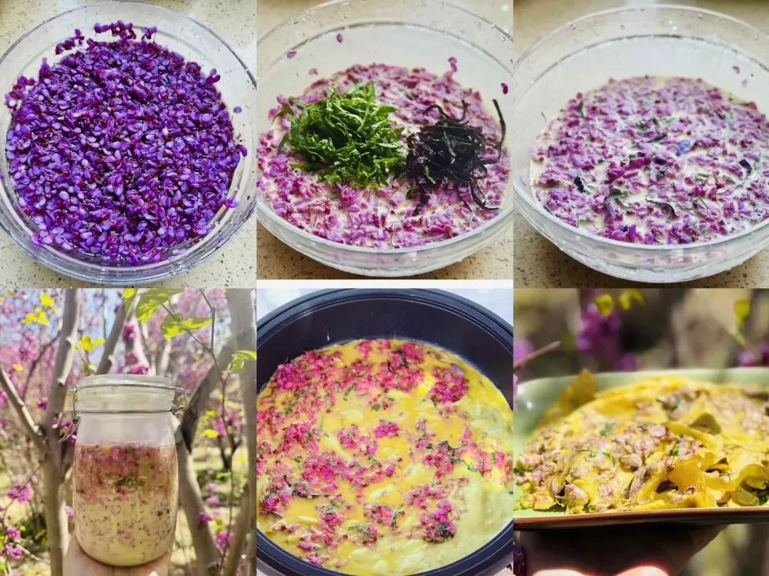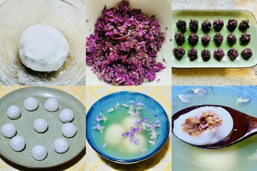 首先上场的是紫荆花鸡蛋紫苏煎饼户外盛宴:在野外树下烹饪,树下吃,和朋友一起分享吃,这是对春的尊重,对花的敬仰。突然又接收到灵感的指示:为何不尝试着用糖浸一下,和点糯米粉做成紫荆汤圆呢? 果真要口感有口感,要颜值有颜值,直接把汤都惊呆了。然后,糖三角从脑袋里跳出来说:“快试试我,试试我”。天呐‼️ 这也也太好看太好了吧!