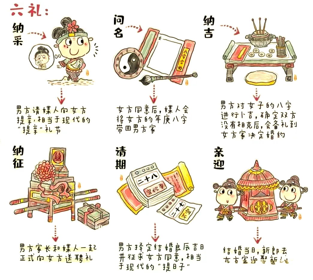 婚姻更是“礼”的一项重要内容。古代婚姻程序是很复杂的,大体要经过纳采、问名、纳吉、纳征、请期、亲迎六道程序,称“六礼”。