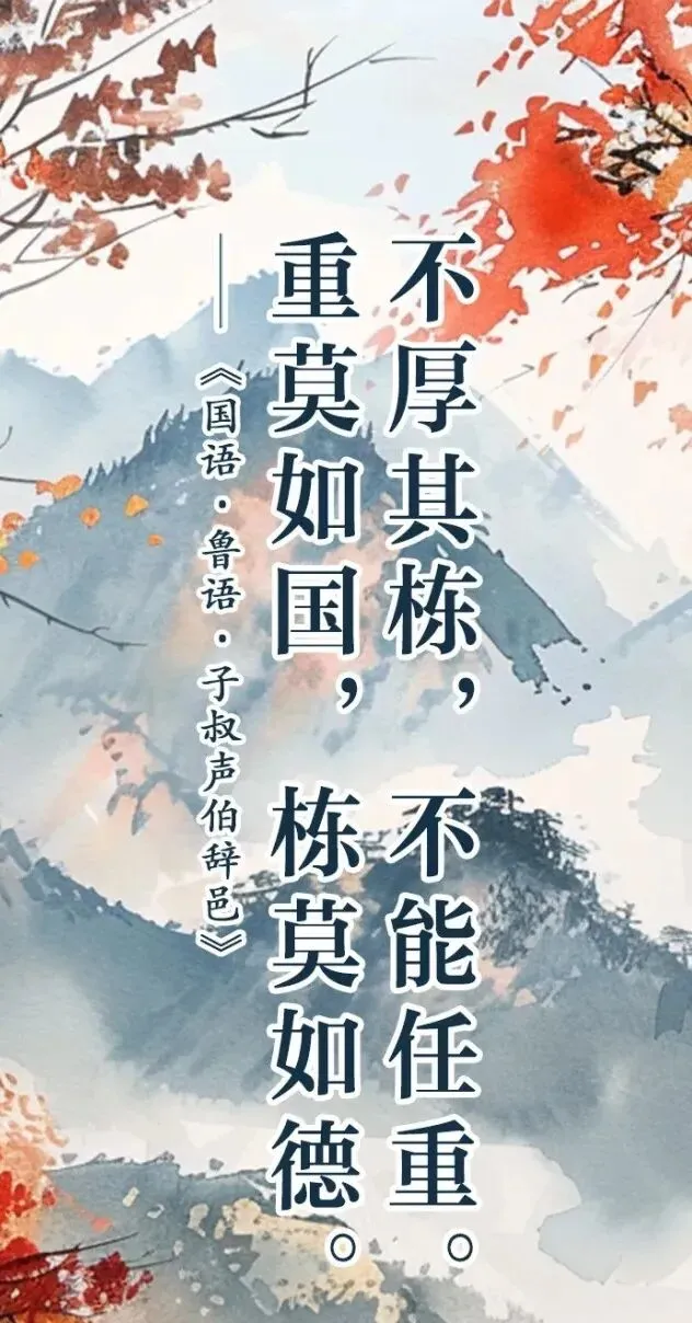 不厚其栋,不能任重;重莫如国,栋莫如德。说的真好,真直白:不增厚栋梁,就不能承受屋顶的重量;再重要也不如国家重要,再是栋梁之才也不如高尚厚实的品德。这句话可以说放之四海而皆准的真理。