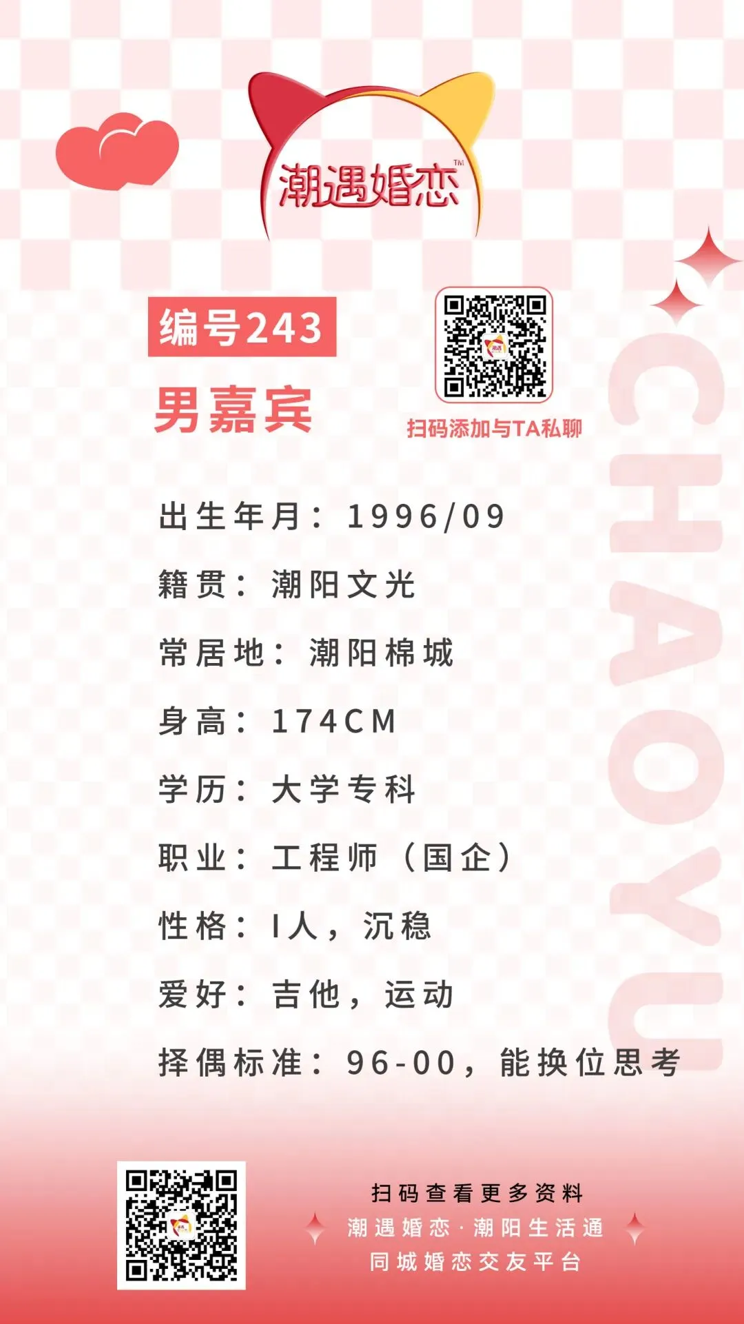 【潮遇婚恋】嘉宾:编号243号男嘉宾 · 常居潮阳棉城,在国企上班~