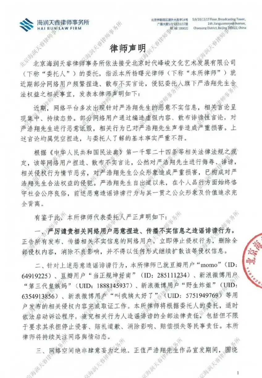澄清: 后来时代峰峻连发两次律师声明,严正否认严浩翔出入商K,指出内容为恶意造谣、诽谤,并已固定证据报警,启动司法追责。