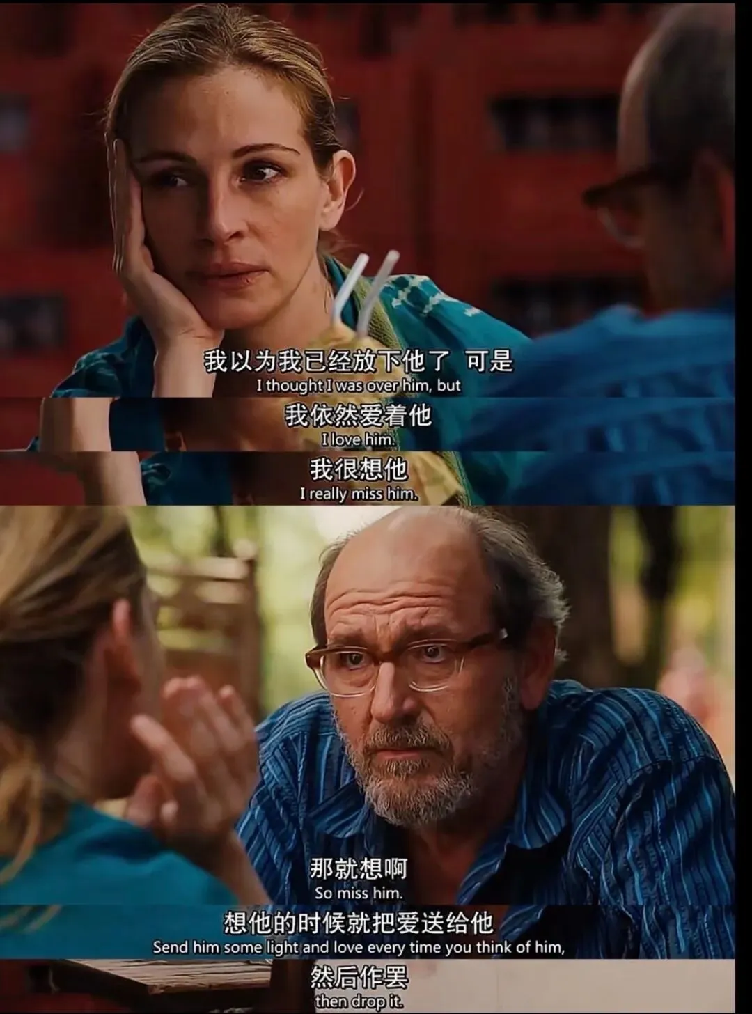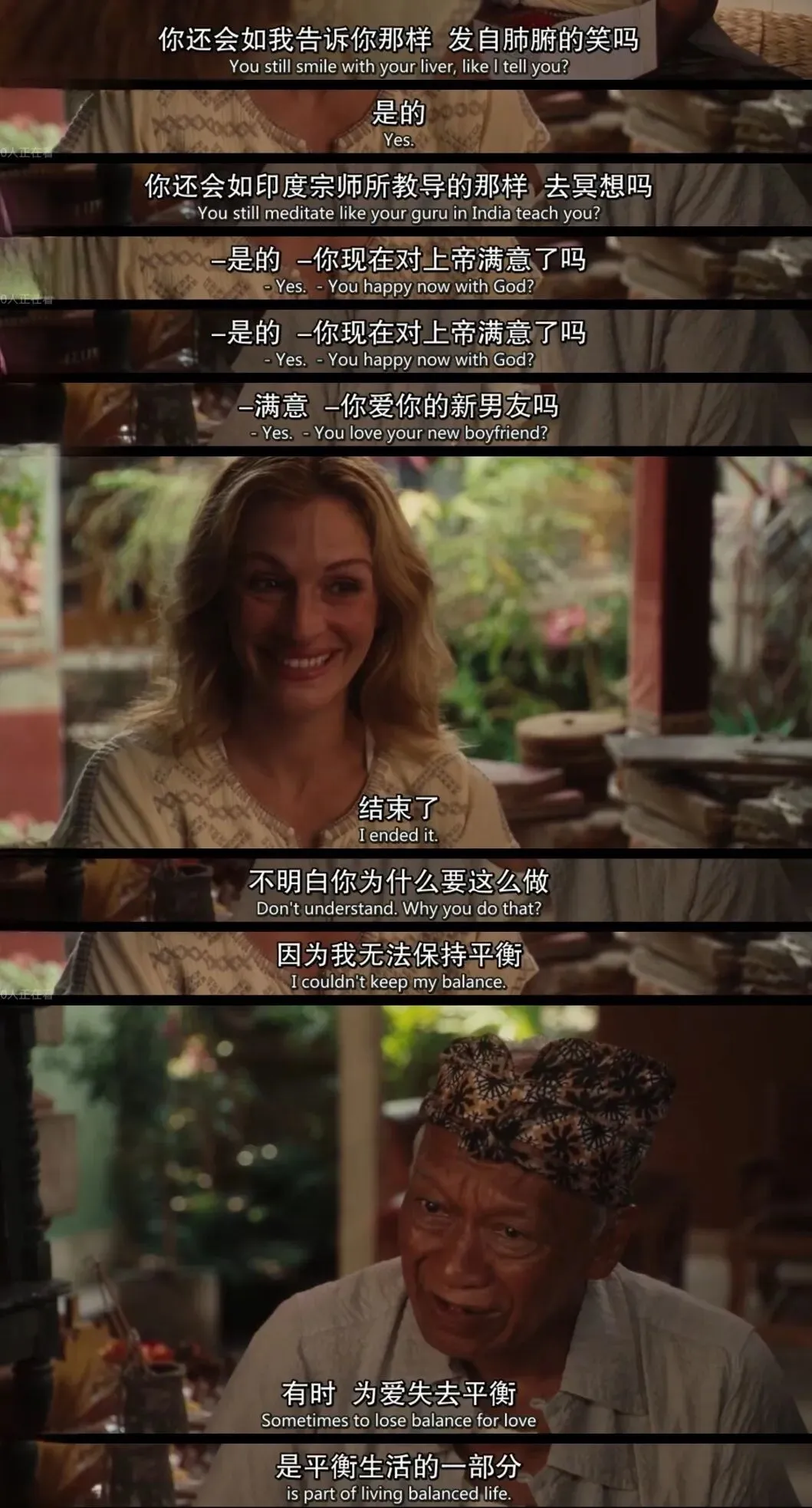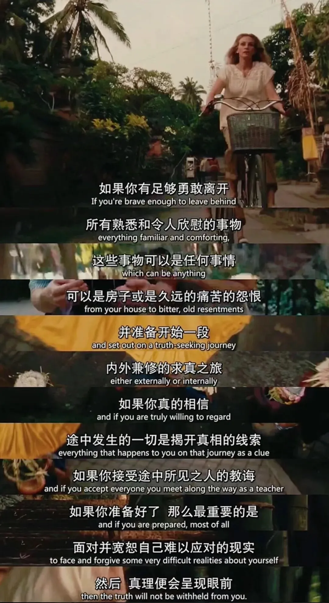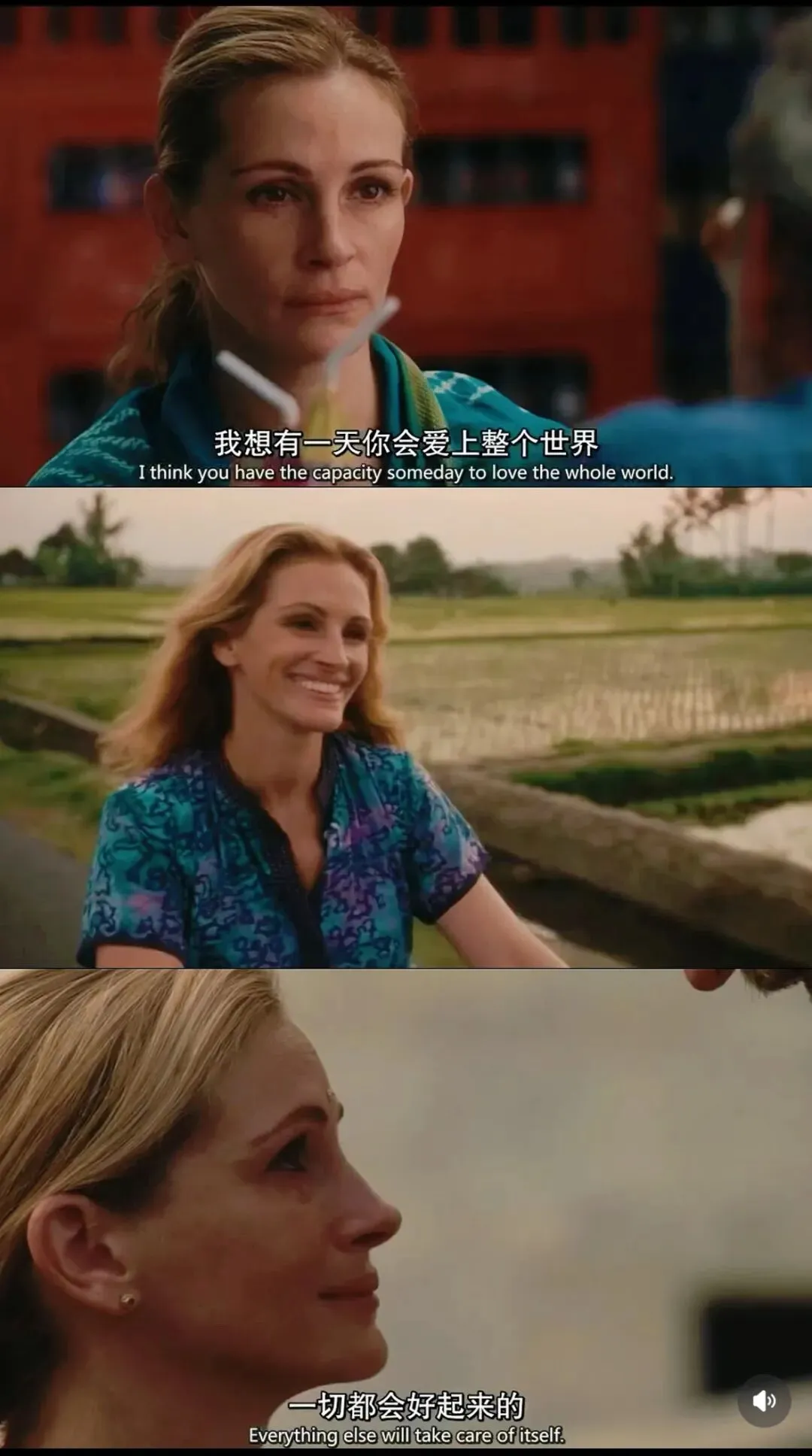 去年还是前年失恋很伤心,看了一部我很喜欢的电影《美食祈祷和恋爱》。今天又看了一下截图,也感觉到很抚慰我。这张截图很长时间都是我某个社交平台的头像。