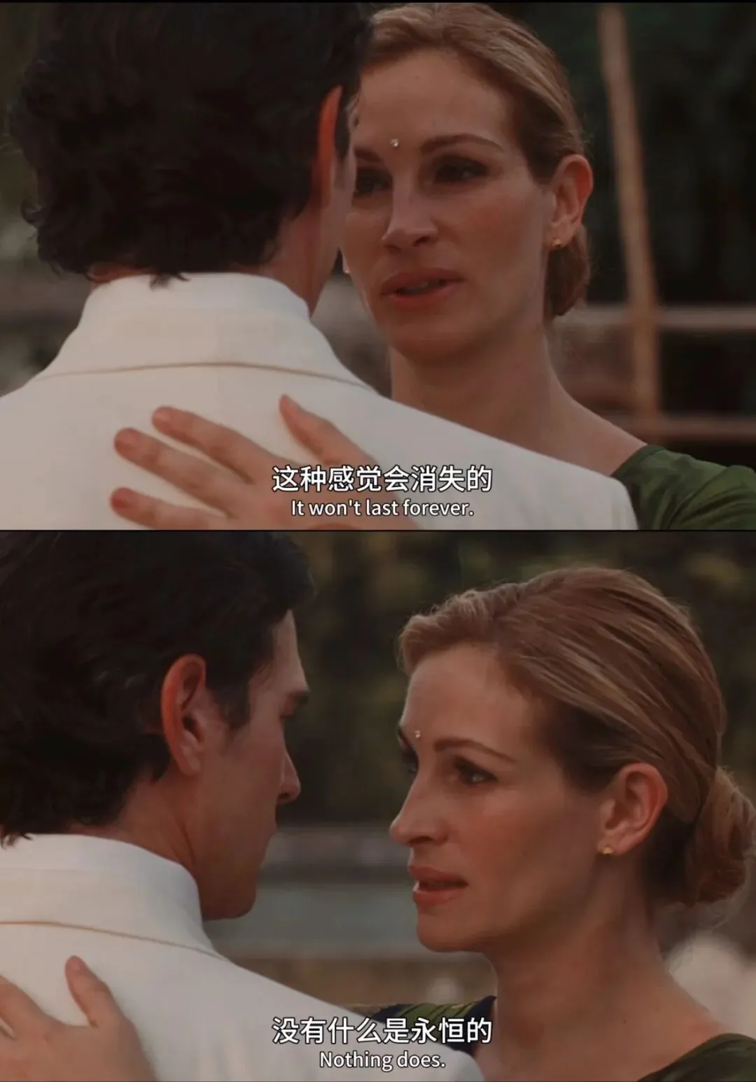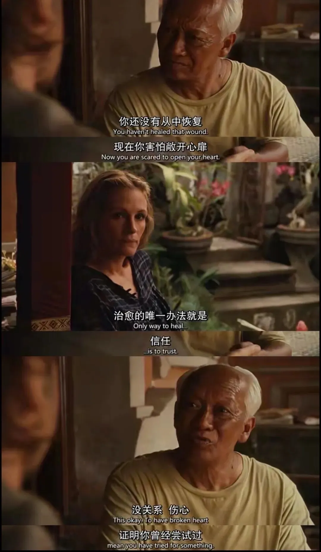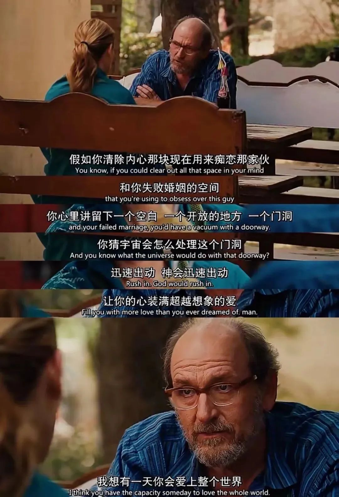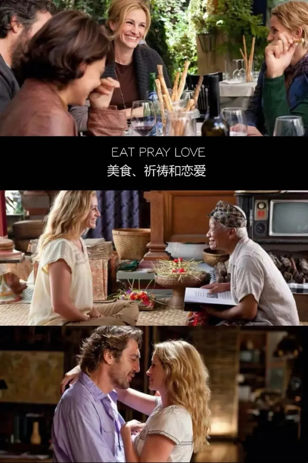 去年还是前年失恋很伤心,看了一部我很喜欢的电影《美食祈祷和恋爱》。今天又看了一下截图,也感觉到很抚慰我。这张截图很长时间都是我某个社交平台的头像。