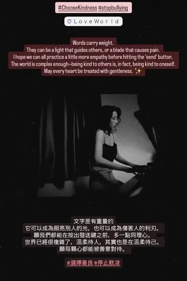 她感性地写道:「文字是有重量的,它可以成为照亮别人的光,也可以成为伤害人的利刃。愿我们都能在按出发送键之前,多一点同理心。世界已经很复杂了,温柔待人,其实也是在温柔待己。愿每颗心都能被善意对待。 」并加上「#选择善良」、「#停止欺凌」等标签,似在暗示自己才是受害者。