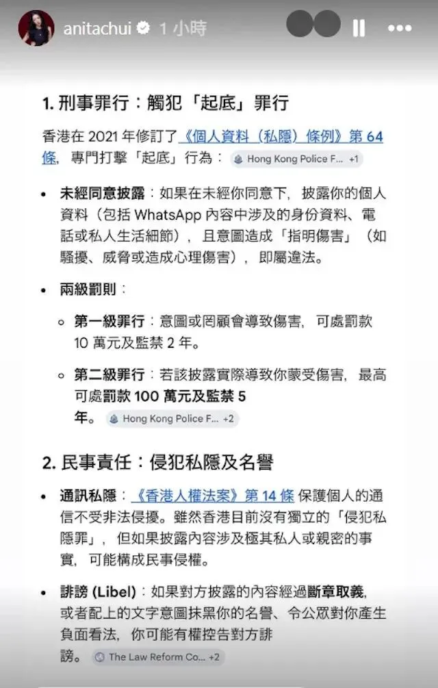 崔碧珈在IG限时动态以灰色背景、白底黑字写下:「请自重,并尊重法律」,矛头直指近日公开私人讯息的行为。她随后贴出详细的法律资讯,列明香港在2021年修订的《个人资料(私隐)条例》第64条,指明未经同意披露个人资料(包括WhatsApp内容、电话或私人生活细节),意图造成伤害即属违法,最高可处罚款100万元及监禁5年。