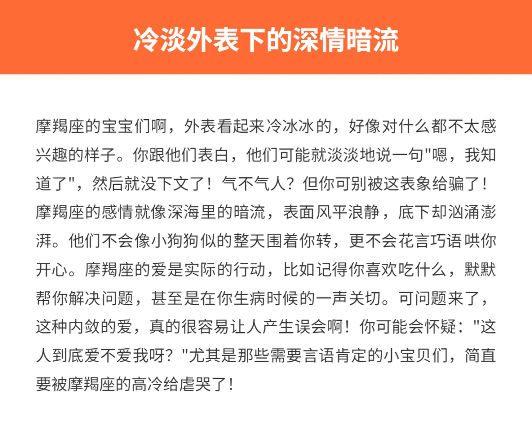亲爱的星座朋友们,你们好呀!今天咱们来聊聊和摩羯座恋爱的那些事儿。哎呀,说起摩羯座,真是又爱又恨啊!摩羯座的宝宝们外表冷静克制,内心却藏着一片深情海洋,只是这份感情不会轻易表露出来。和摩羯座谈恋爱,你可能会经历从怀疑"ta到底爱不爱我"到"原来ta这么爱我"的心路历程。但是呢,这段恋爱可不是那么好谈的,摩羯座的专一和认真背后,藏着让你又爱又恨的相处模式。想知道和摩羯座恋爱会有哪些虐心体验吗?跟着我一起来看看吧!