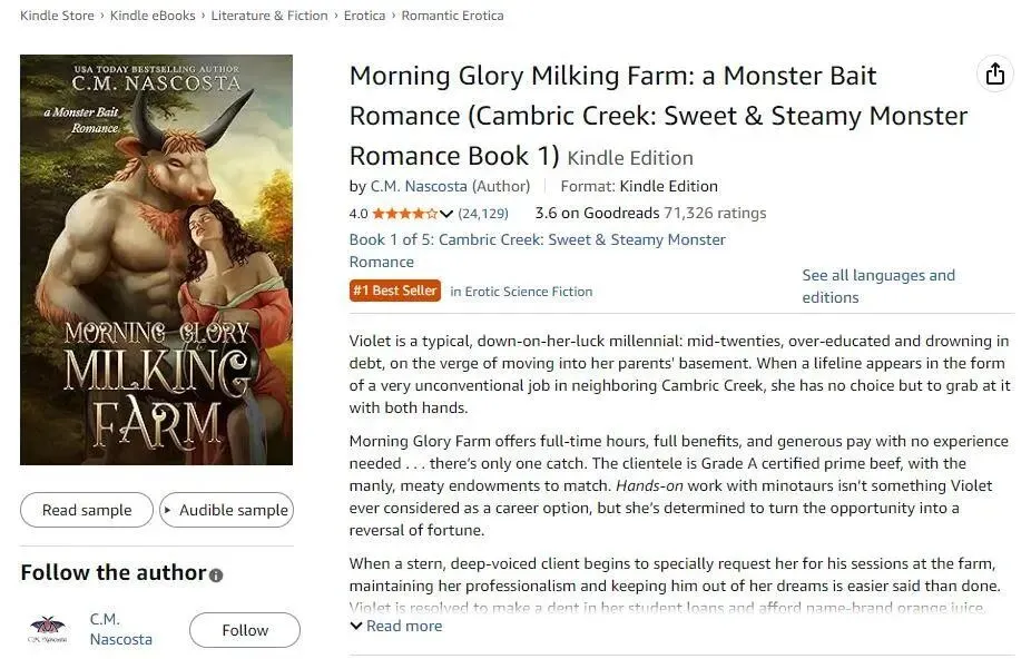 给大家科普一个恐怖的真相:亚马逊女频销量top1的小说——Morning Glory Milking Farm。这不是什么小众地下读物,而是英文类小说销量第一,还是正儿八经的女频书之王。