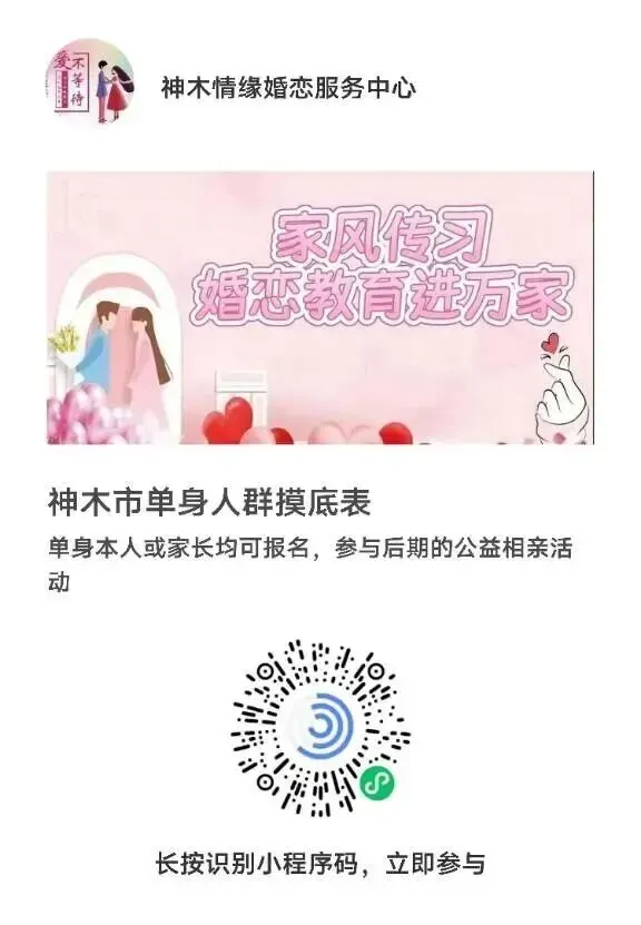 本项目是响应国家号召、深化家庭文明建设的重要举措。单身朋友及家长可扫下方二维码报名参与后期的系列活动:本活动是纯公益项目,意在传承优良家风、树立理性婚恋观、为广大家长及单身青年搭建一个安心、放心、靠谱的交流平台。