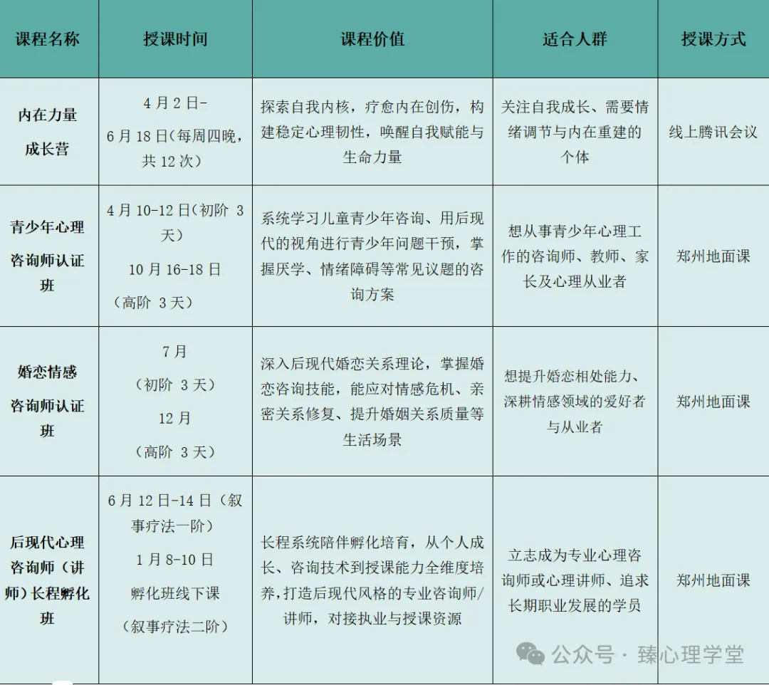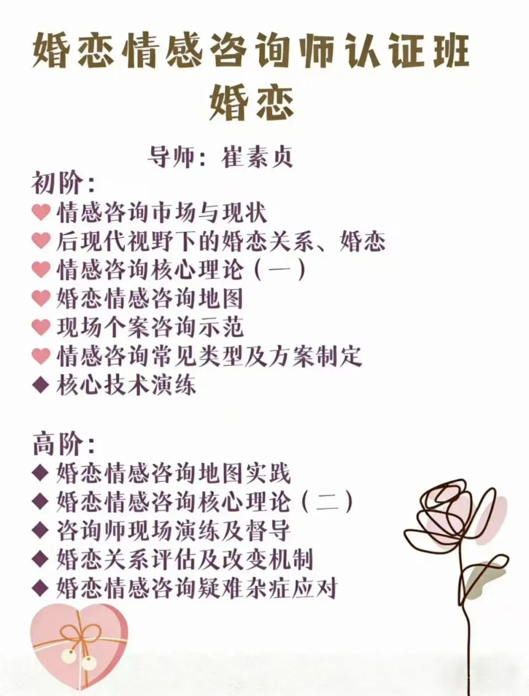 针对婚恋小白、单身群体、婚恋困惑者,我们打造了专属婚恋基础课程,聚焦亲密关系构建、婚恋心理认知、两性沟通技巧、择偶标准梳理、婚恋矛盾化解等内容,从最基础的婚恋知识讲起,手把手帮大家树立正确婚恋观,掌握经营亲密关系的能力,解决日常情感难题,让每一个人都能学会爱与被爱,轻松走出婚恋困境,牢牢把握属于自己的幸福。同时,臻心理一直进行【婚姻情感咨询师认证班】的培训,打造从0到1一站式成长体系。不管你是零基础的行业小白,还是想要深耕婚恋咨询领域的从业者,都能在这里实现全方位成长。课程从专业理论知识、咨询实操技巧,到案例实战演练、职业发展规划,层层递进教学,不仅能让你系统掌握婚姻情感咨询专业技能,顺利考取相关认证,更能解锁职业变现路径,在帮助他人解决情感难题、收获幸福的同时,实现自我价值提升,开启一份有温度、有前景的全新事业。