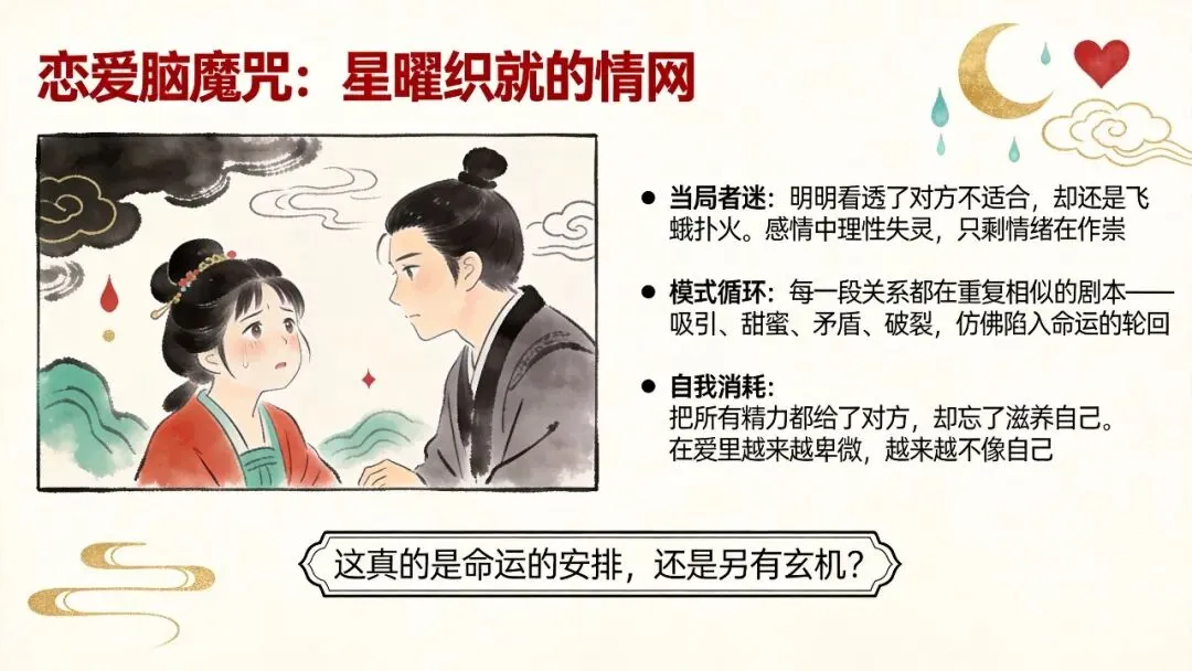 很多人奇怪,为什么恋爱会让人“大变样”?你以为你变了,其实只是被爱情这把钥匙,打开了你命盘里平时沉睡的宫位。这位男命主的本命夫妻宫位于申宫,坐守七杀入庙,配以右弼化科。七杀代表着一种浓烈、直接且带有征服欲的爱。这意味着他平时看起来理智,可一旦进入感情,那种“右弼科”的温情与“七杀”的执着交织,会让他迅速从理性人变成情感的俘虏。这种变化,其实早就在他的星曜轨迹中写好了剧本。