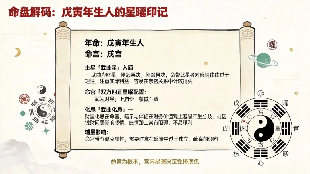 姐妹们,你们有没有发现一个魔咒:明明平时是个独当一面的"大女主",一谈恋爱就秒变"恋爱脑"?昨天还能一个人扛桶水上六楼,今天连瓶盖都拧不开了。其实这种反差,在命理学中有着深刻的根源。就像这位生于戊寅年的命主,他的本命命宫坐落在戌宫,主星是武曲入庙。武曲本是冷硬的将星,平时杀伐果断,但因为宫干引发了武曲化忌,他内心其实常有一种无法言说的孤独感和自我设限,这种“硬汉”外壳下藏着的脆弱,往往在遇到亲密关系时会彻底崩塌。