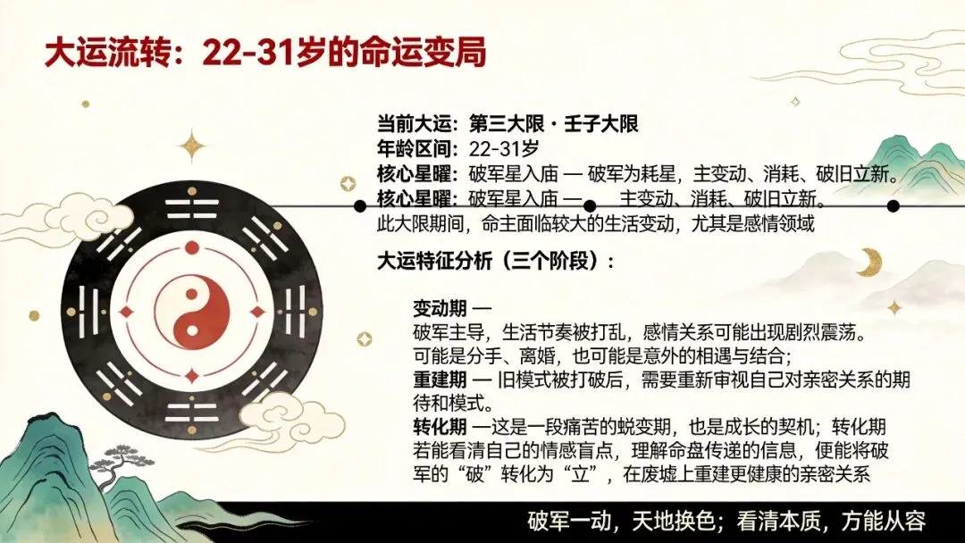 我们再看他当下的运势。命主现正处于第三大限,即22~31岁这段黄金时期。此时的大限命宫重叠了本命福德宫,宫位在子,主星为破军入庙。破军主变动、消耗与重组,在大限能量的催化下,他在这个十年里的情感观是非常激进且富有破坏力的。此时他的大限夫妻宫正好进入了本命命宫的戌位,并触发了武曲化科。这说明在这个大限里,婚姻与感情会成为他建立自我名望或身份认知的关键,恋爱对他而言不再只是消遣,而是一种精神上的重生。