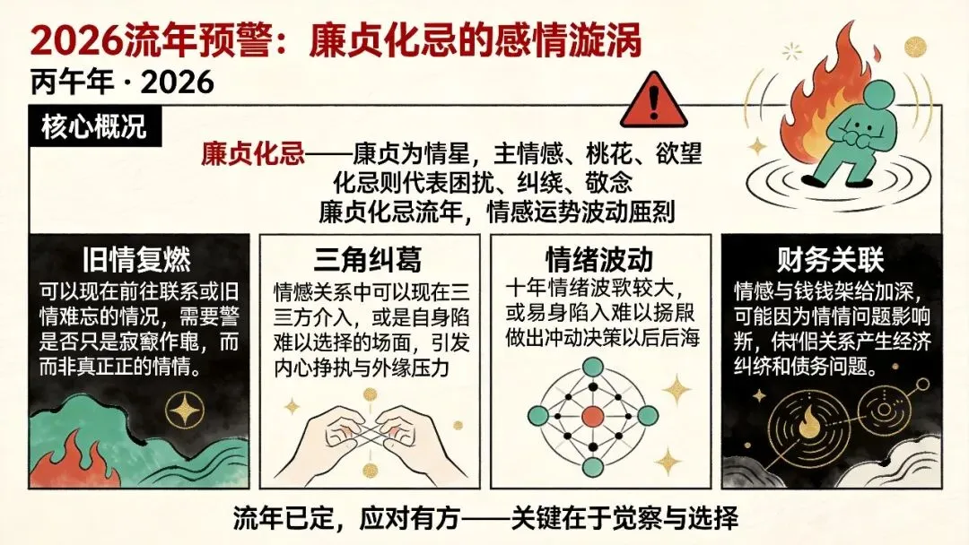 到了具体的2026年,岁次丙午。这一年的流年命宫落入本命财帛宫的午位。这里有廉贞与天相入庙坐镇,看起来似乎格局稳定,但由于丙干引发了廉贞化忌,这一年的感情极易带有纠缠与囚困的色彩。廉贞是次桃花,化忌则主感情上的想不开、钻牛角尖。配合流年夫妻宫在辰宫,受到对宫武曲忌和文曲陷的影响,2026年对他来说,是一场关于“信任与放手”的修行。如果处理不好,这种“恋爱脑”带来的窒息感,极易转化为财务或精神上的双重消耗。