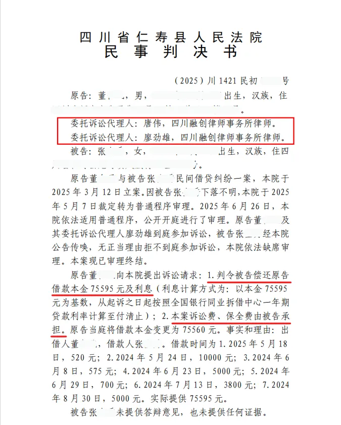 四川融创律师事务所受到原告委托后。 面对被告下落不明的难题,唐伟律师和廖劲雄律师迅速协助法院启动公告送达程序,确保诉讼程序依法推进;庭审前,律师们不仅全面梳理了双方的微信聊天记录、转账凭证及取款记录等证据,精准提炼出被告承认“借款”及同意出具借条的关键内容,还结合案件事实调整诉讼请求,主动放弃对“520”红包等赠与性质款项的主张,聚焦核心借贷关系,避免争议焦点分散;庭审中,代理律师廖劲雄充分举证、清晰阐述法律逻辑,围绕“借贷合意”与“实际交付”两大要件,有力论证借贷关系的合法性,即便被告缺席,仍通过完整证据链让法院清晰还原事实;不仅助力当事人实现诉求,更彰显了融创律所对每一起案件的认真负责与对法律公平的坚守。