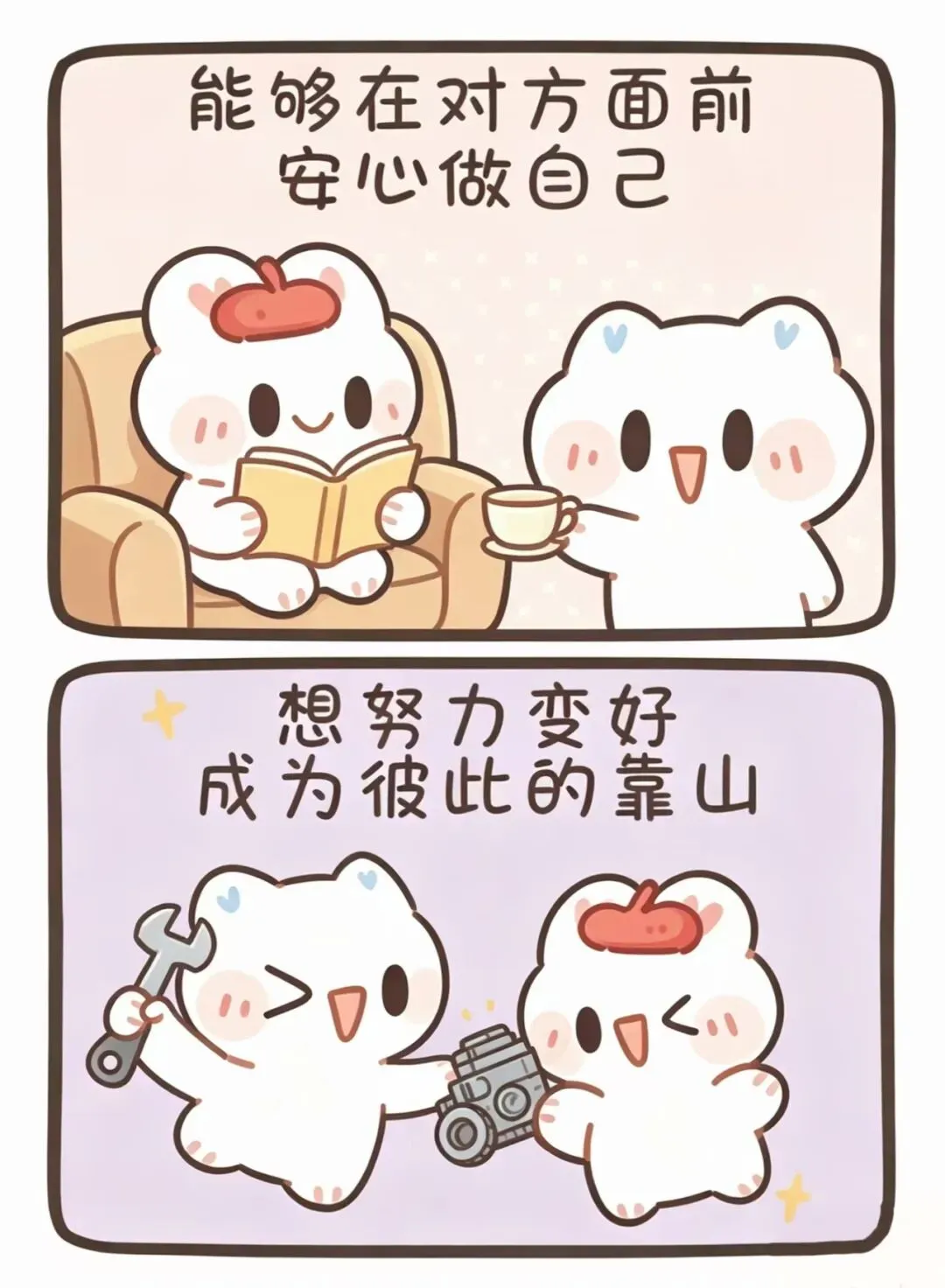 最后也希望我们都能在爱情里保持自我,又能互相兼容,你们互相成就,共同进步,既拥有甜甜的恋爱,也蜕变成更优秀的自己。