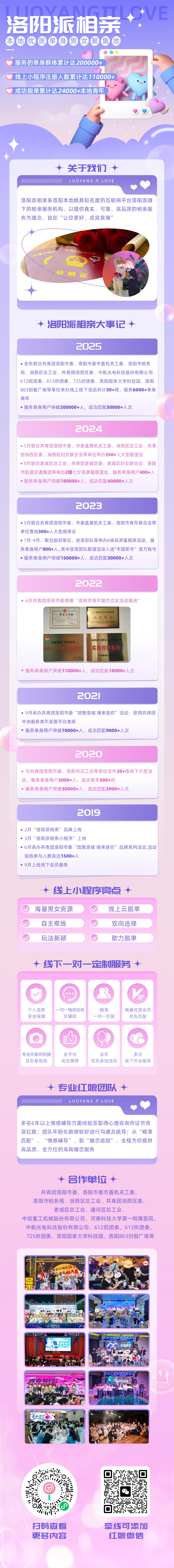 洛阳派相亲线上用户180000+,常年举办线上线下活动,形式新颖符合当代青年需求,用户多为企事业单位人员,条件优秀。