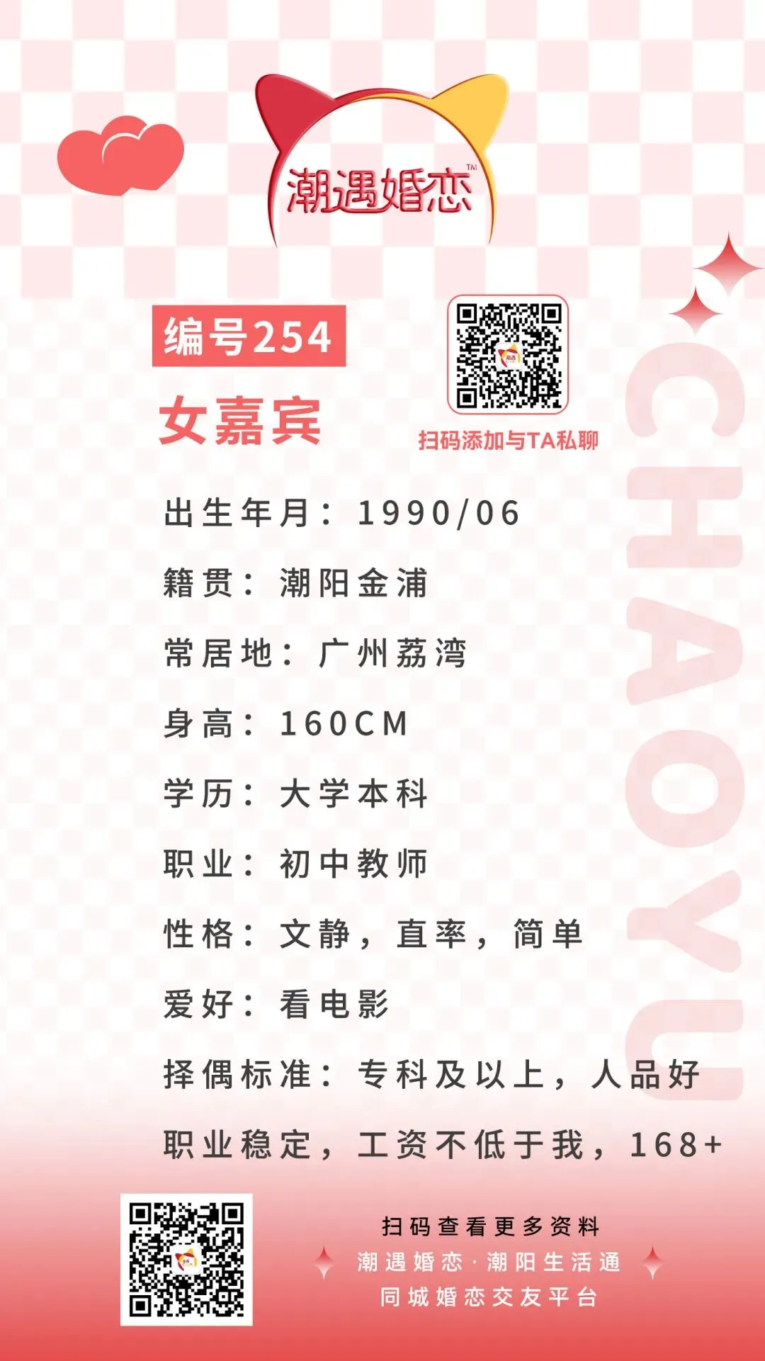 【潮遇婚恋】嘉宾:编号254号女嘉宾 · 常居广州荔湾,初中教师~
