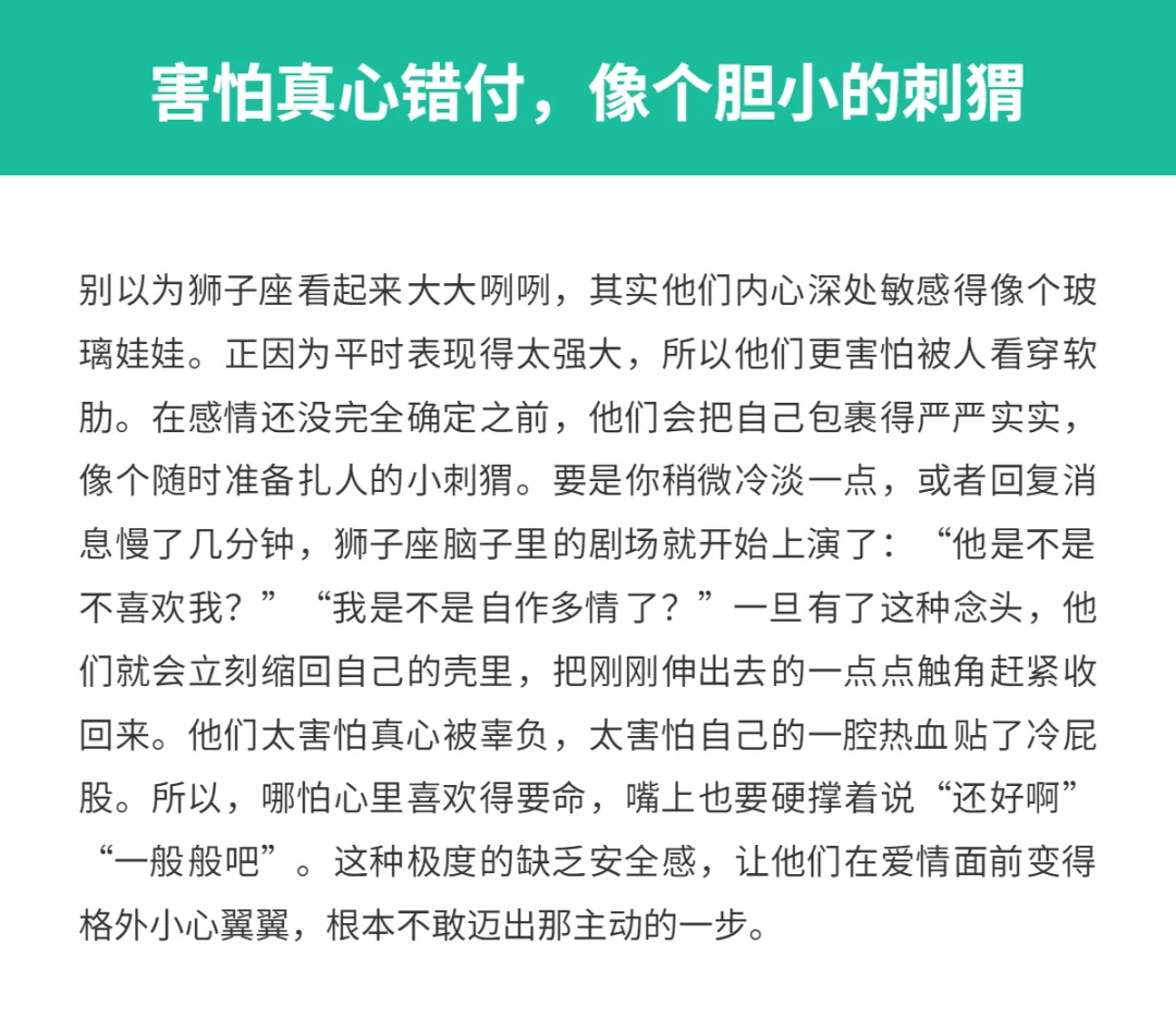 大家总觉得,这么光芒万丈的狮子座,遇到喜欢的人肯定也是直接冲上去表白,像电视剧里的霸道总裁一样吧?