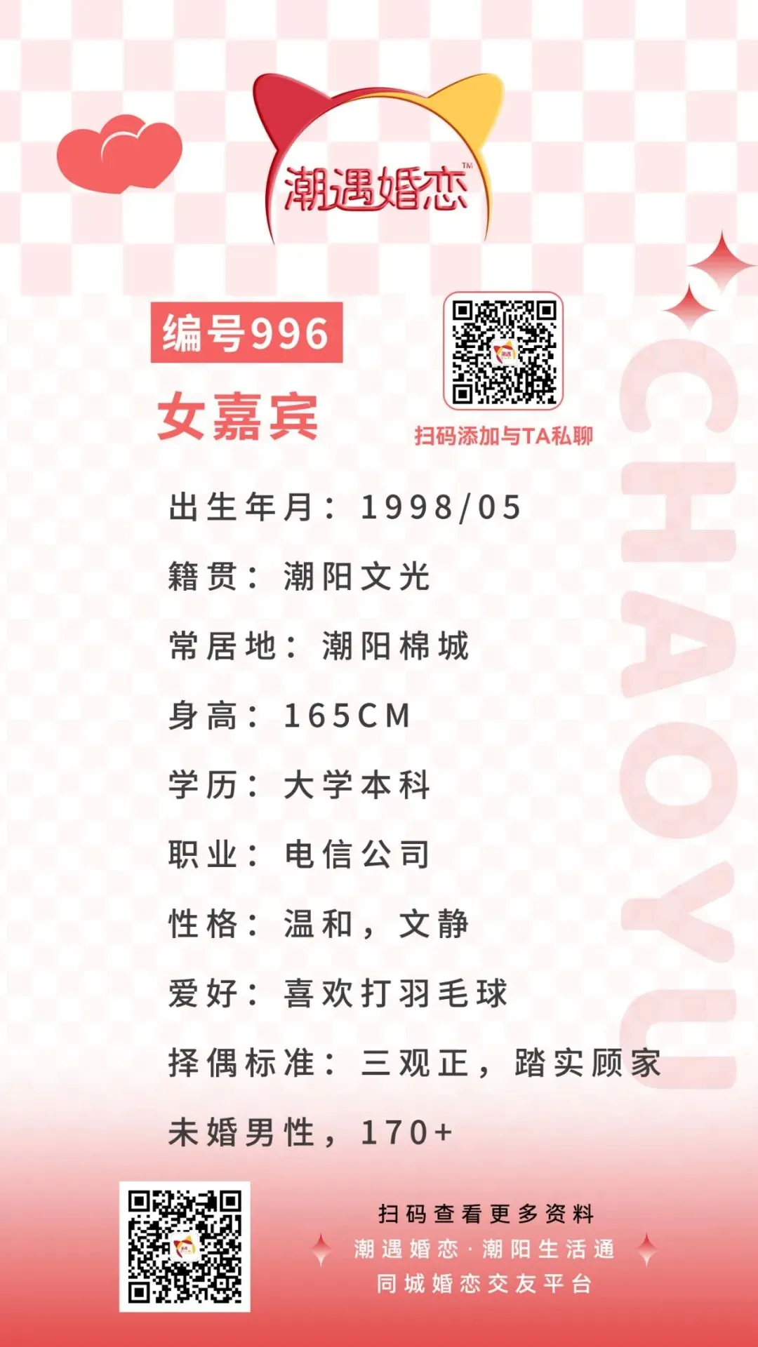 诚意想与嘉宾认识的可扫码联系潮遇红娘牵线,将本期嘉宾的编号/交友卡片发送给潮遇红娘,开启心动模式,与嘉宾微信聊天深入了解哟!