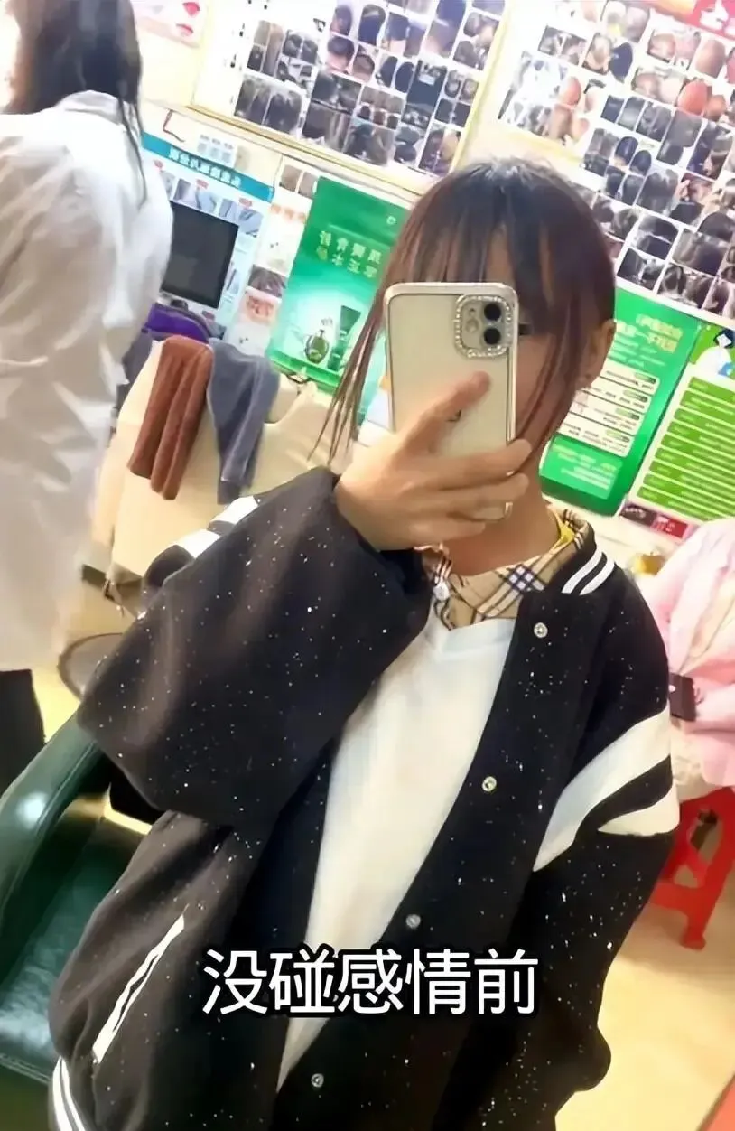 前后变化很大,没谈的时候还可以摆出“酷”的姿势,在理发店门口拍照、骑着摩托车合照、和朋友外出游玩,仿佛一只刚刚学会装大人的小鸟;谈了之后造型没有改变,但是精神状态却好像被抽走了似的,哭闹、伤胳膊,整个人一下子垮下来。