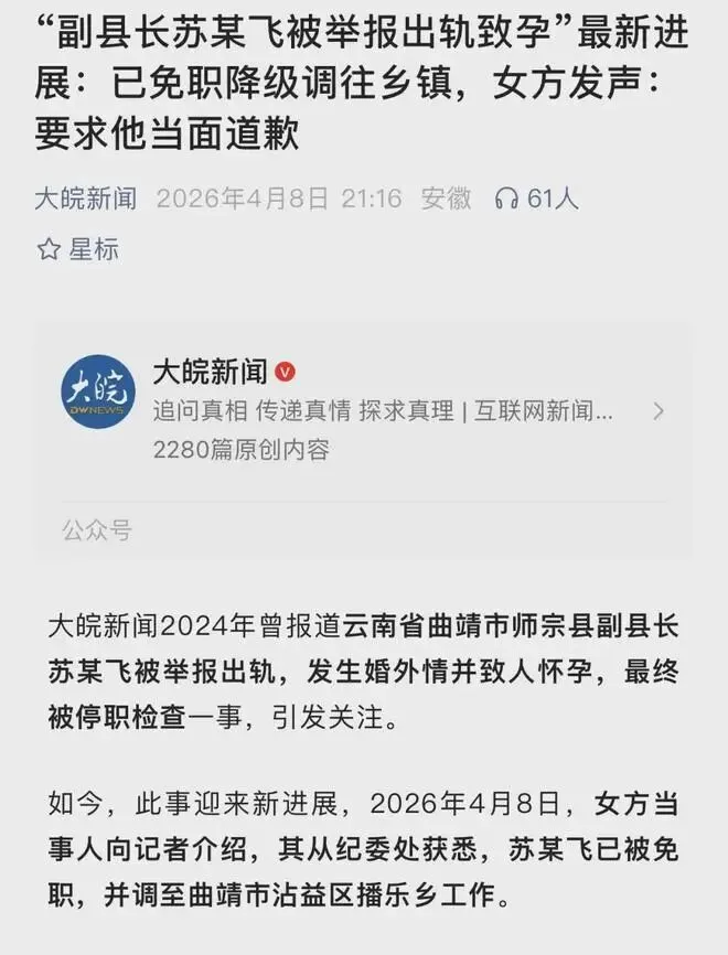 苏副县长跟人家是上下级关系,还骗人家说自己单身,致人怀孕后又逼人流——这要是拍成电视剧,弹幕都得刷“渣男”。组织上显然也觉得这事儿不地道,给了他相应的党纪处分。虽然没直接开除党籍,但党内警告+降职的组合拳,也算“打得不轻”。