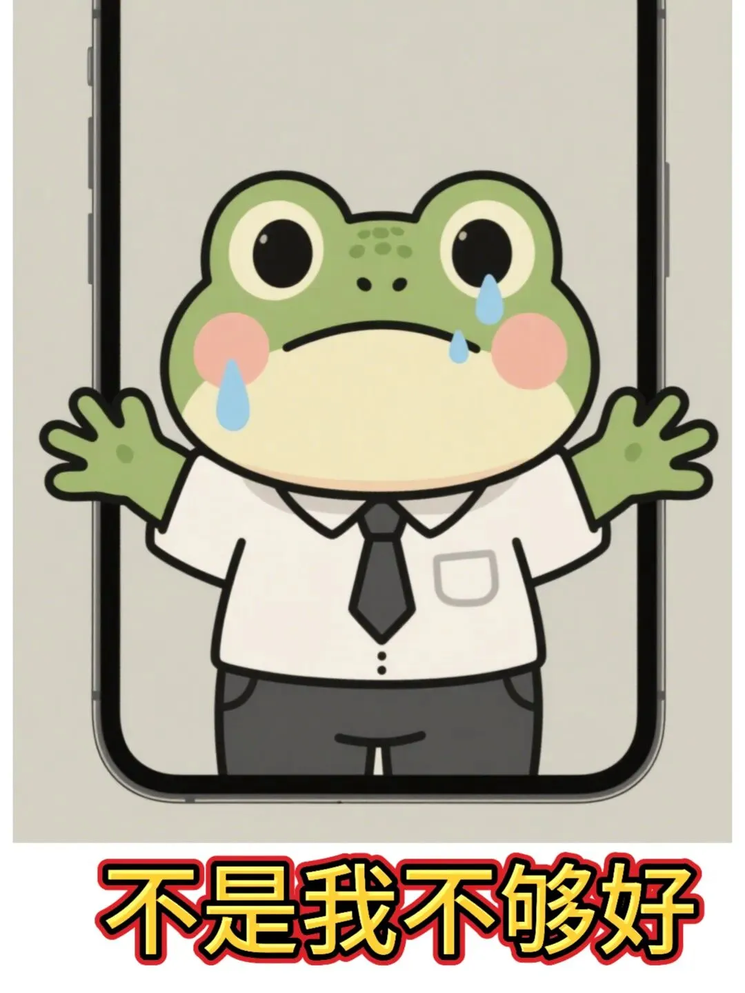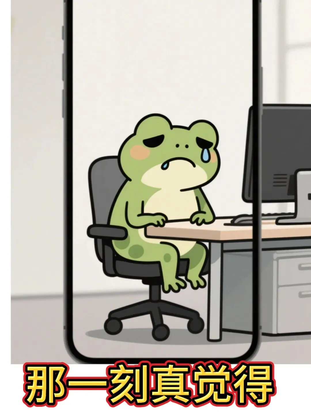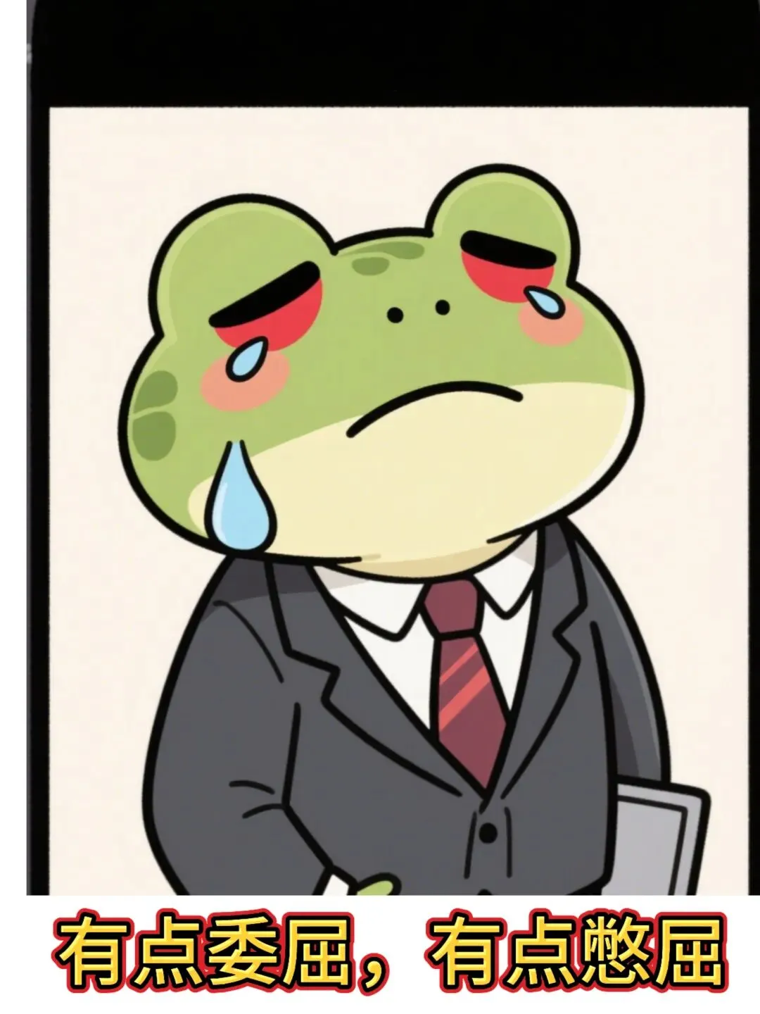 卡通职场青蛙鼓着腮帮子,眼眶红红,低头憋着情绪,又委屈又倔强,可爱治愈画风