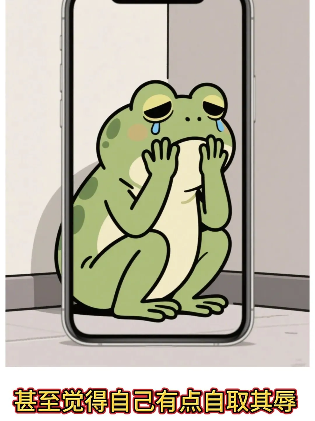 卡通职场青蛙捂脸蹲在角落,背影孤单又好笑,心酸自嘲感拉满,简约背景,治愈卡通风格