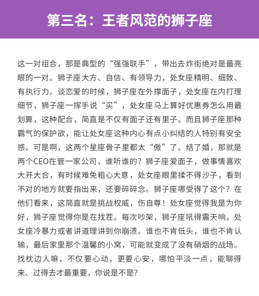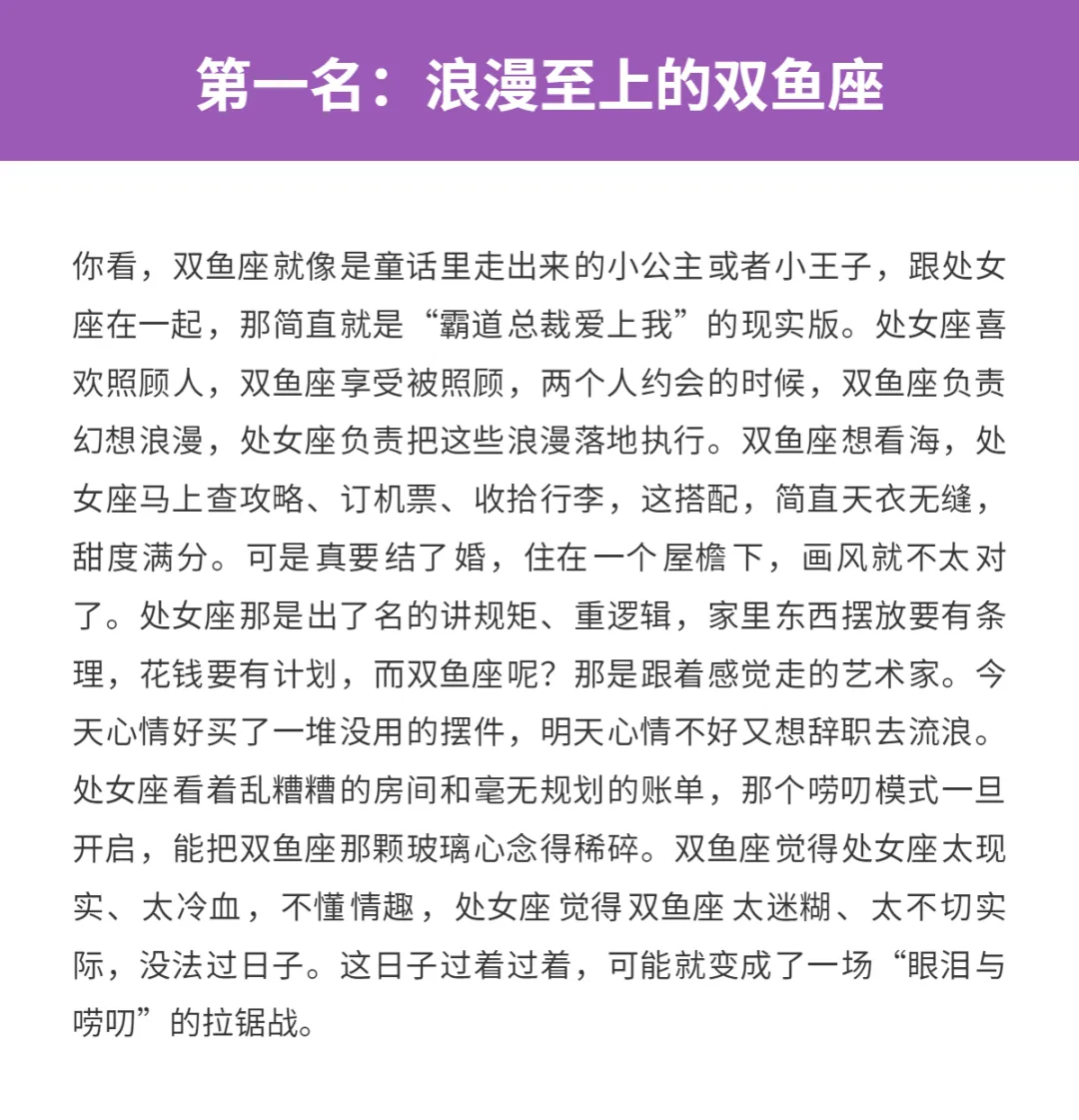 今天咱们就来盘点一下,那几个跟处女座谈恋爱很甜,但结婚可能要“慎重”的星座。