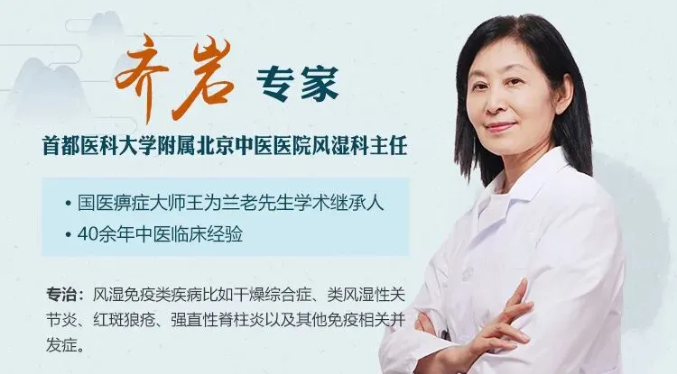专家简介:齐岩,主任医师,师从我国风湿免疫学科奠基人、国医大师王为兰老先生,首都医科大学附属北京中医医院风湿科主任医师,现为中国民族卫生协会北京融科医院特邀专家。从事风湿免疫疾病中医临床工作40余年,擅长通过辨病+辨证,以精方为基,虫药入络,辅以再生疗法等先进疗法治疗各类风湿免疫疾病,提升临床疗效。 尤其在风湿免疫类疾病比如干燥综合症、类风湿性关节炎、红斑狼疮、强直性脊柱炎以及其他免疫相关疾病和各种疑难杂病如肾炎、肾病综合征、冠心病、三高症、脂肪肝、慢性胆囊炎、慢性结肠炎、溃疡病、过敏性鼻炎、哮喘、慢支等免疫相关疾病。对于治疗过敏性皮肤病、牛皮癣、痤疮、湿疹和黄褐斑也有很好的疗效,特别是在老年病预防和抗衰老方面有独特见解。