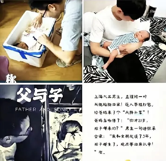 上海一个大三男生,恋爱谈了三年,女朋友怀上了,还是双胞胎。小伙子也爽快,没推没躲,领着女孩带着娃回家,给爹娘送了一对双孙。