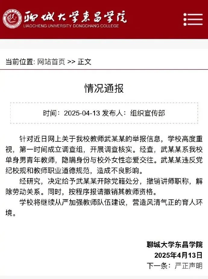 近日,聊城大学东昌学院经济系一教师被举报使用假身份,8年来与多名女学生恋爱、发生关系。4月13日深夜,聊城大学东昌学院官网发布情况通报: