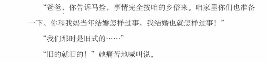 这是一种主动的自我贬低,她把被高加林抛弃,理解成了因为我太旧了,所以被新东西取代了。于是她用一场旧式婚礼,来给自己的旧盖棺定论。