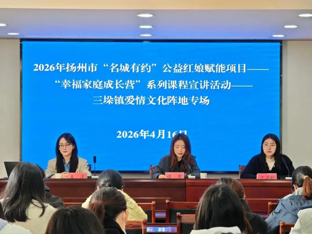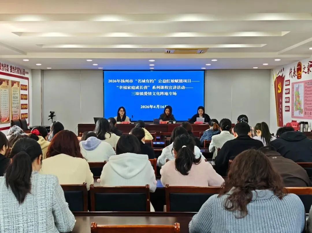 为深入贯彻落实市委、市政府民生实事项目部署,助力新型婚育文化建设,4月16日上午,2026年扬州市“名城有约”公益红娘赋能项目——“幸福家庭成长营”系列课程高邮首场宣讲活动在三垛镇成功举办。市妇联家儿部部长谭萌,扬州大学专职辅导员、讲师王潆,三垛镇40余名年轻干部代表参加活动。