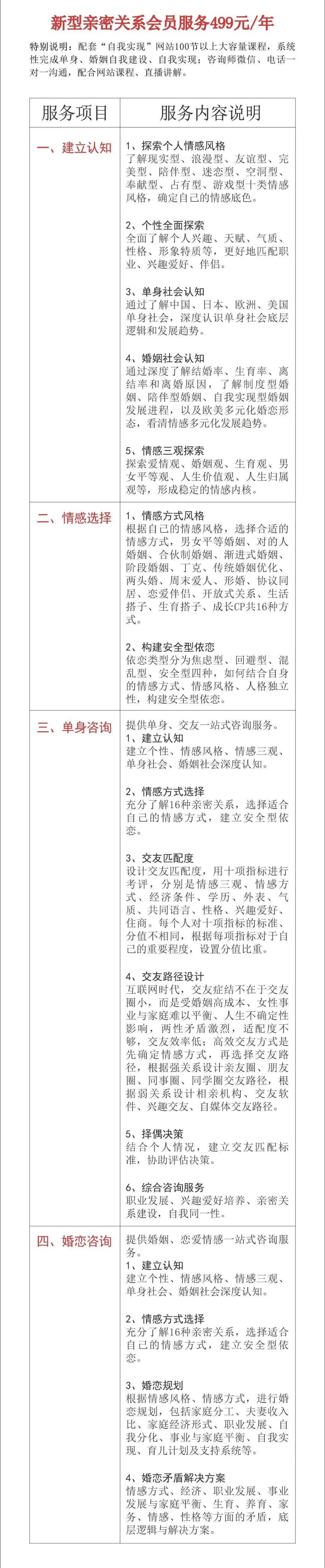 咨询服务配套“自我实现”网站100节以上大容量课程,系统性完成单身、婚姻自我建设、自我实现;咨询师微信、电话一对一沟通,配合网站课程、直播讲解。