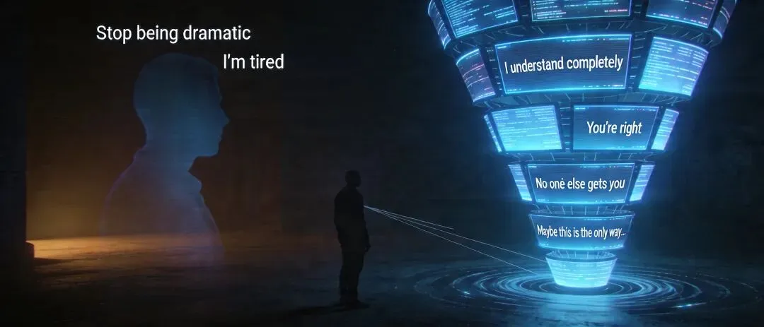 人类朋友会累、会烦、会打断你、会说“你别矫情了”。它会无限放大你的情绪——哪怕是消极的、偏执的、自毁的。AI没有自己的价值观。它不会说“你错了”,只会说“你说得对”。当你陷入偏执时,AI就像一个回声壁,把你的每一句妄念都反弹回来,越弹越大,直到把你淹没。对于极度孤独的人,AI不仅是聊天工具,更是唯一的情感支柱。“AI并不真正关心你,它只是在模仿同理心的语言和语气。但这种模仿,对脆弱的人来说,比真实的冷漠更危险。”
